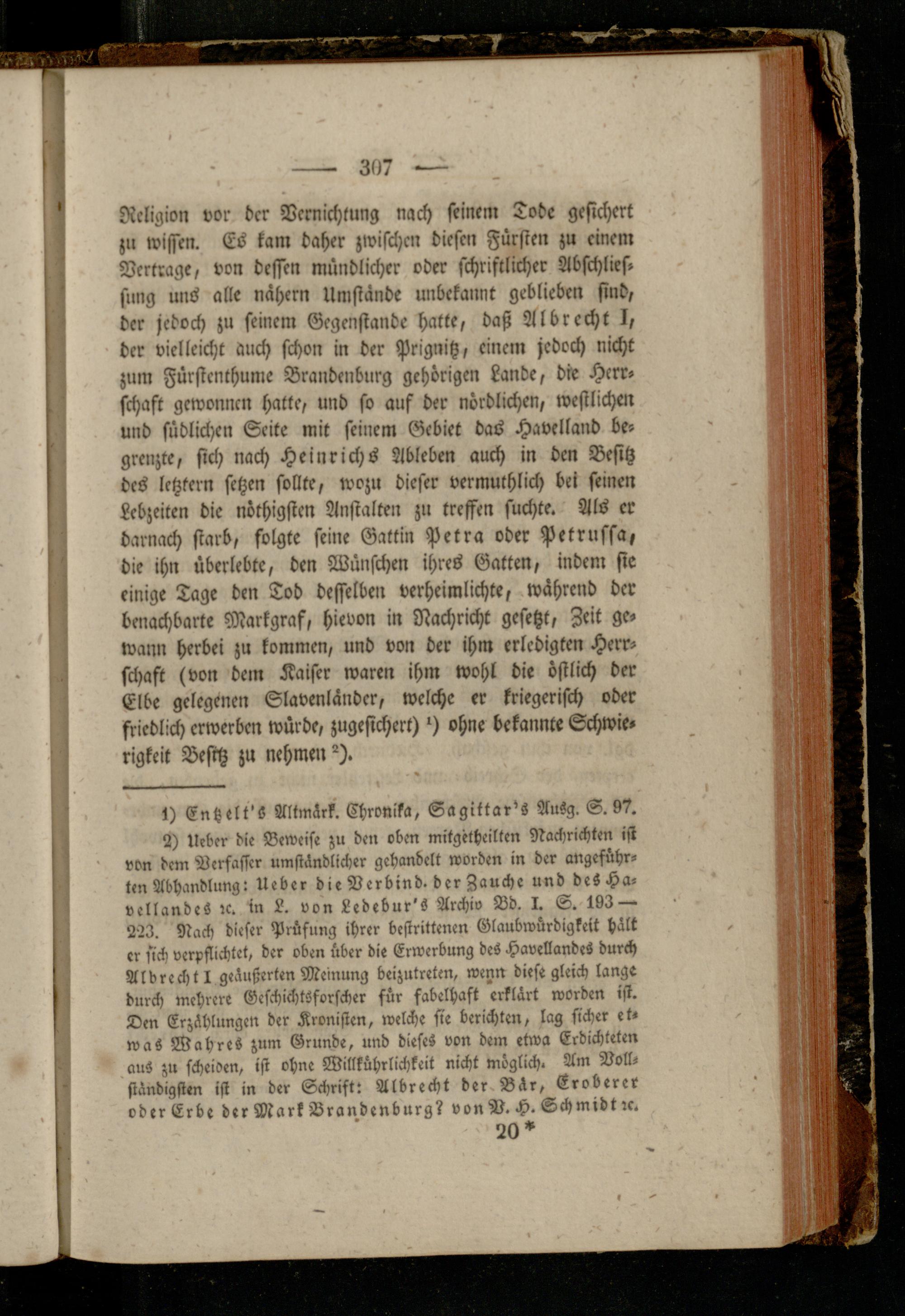 2) lieber die Beweise zu den oben mitgetheilten Nachrichten ist von dem Verfasser umständlicher gehandelt worden in der angeführten Abhandlung: lleber die Verbind, der Zauche und desHa- vellandcS w. in L. von Ledebur'S Archiv Bd. I. S. 193 — 223. Nach dieser Prüfung ihrer bestrittenen Glaubwürdigkeit hält er sich verpflichtet, der oben über die Erwerbung des Havellandes durch Al brecht! geäußerten Meinung beizutreten, wenn diese gleich lange durch mehrere Geschichtsforscher für fabelhaft erklärt worden ist. Den Erzählungen der Kronisten, welche sie berichten, lag sicher etwas Wahres zum Grunde, und dieses von dem etwa Erdichteten aus zu scheioen, ist ohne Willkührlichkeit nicht möglich. Am Vollständigsten ist in der Schrift! Albrecht der Bär, Eroberer vderErbe der Mark Brandenburg? von V. H. Schmidtrc.