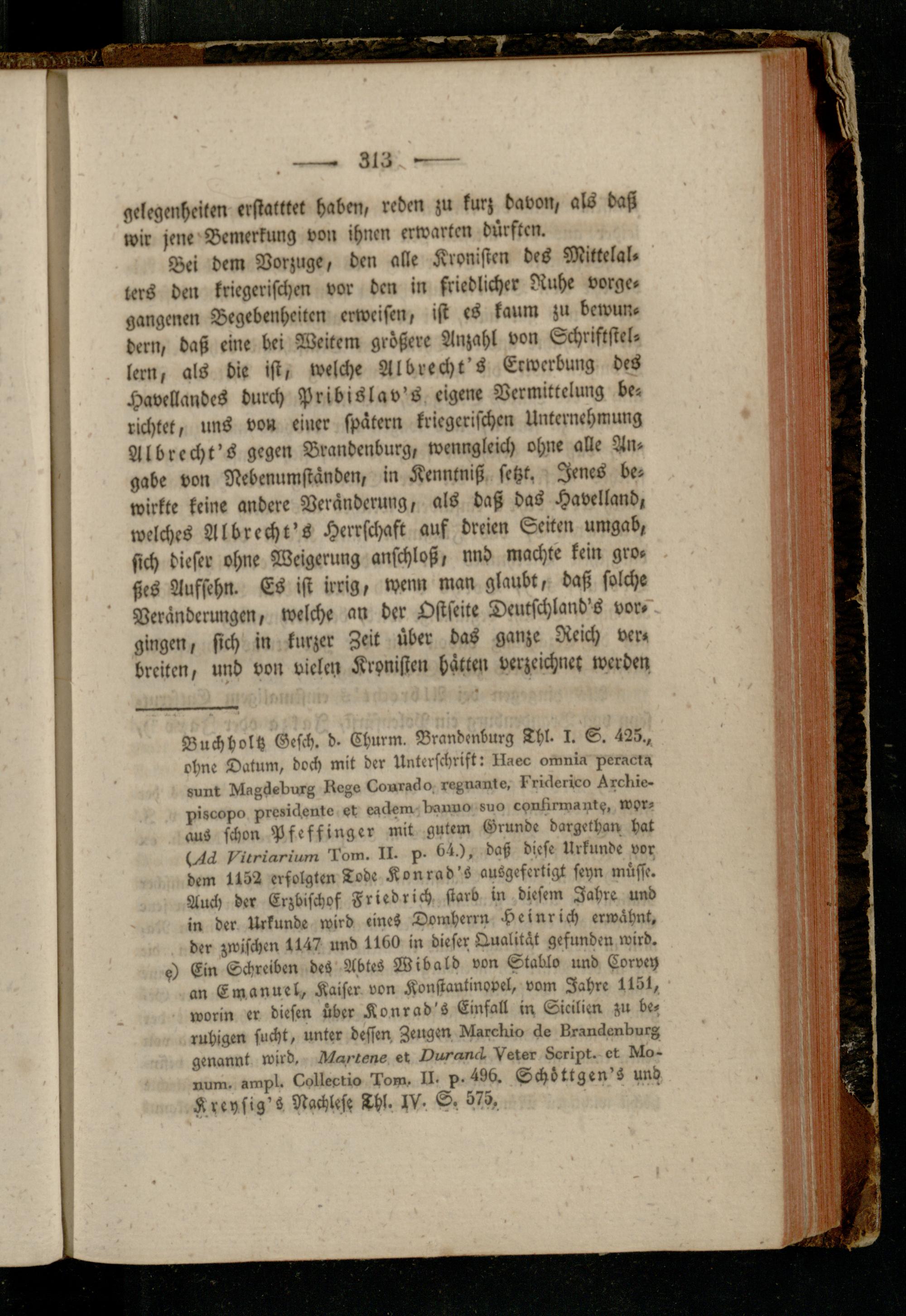 Bei dem Vorzüge, den alle Kronistcn des Mittelalters de» kriegerischen vor den in friedlicher Ruhe vorge- gangenen Begebenheiten erweisen, ist es kaum zu bewundern, daß eine bei Weitem größere Anzahl von Schriftstellern, als die ist, welche Al brecht's Erwerbung des Havellandes durch Pribislav's eigene Vermittelung berichtet, uns von einer später» kriegerischen Unternehmung Albrecht's gegen Brandenburg, wenngleich ohne alle Angabe von Nebenumständen, in Kenntniß setzt, Jenes bewirkte keine andere Veränderung, als daß das Havelland, welches Albrecht's Herrschaft auf dreien Seiten umgab, sich dieser ohne Weigerung anschloß, nnd machte kein gro. ßes Aufsehn. Es ist irrig, wenn man glaubt, daß solche Veränderungen, welche an der Ostseite Deutschland's vor-. gingen, sich in kurzer Zeit über das ganze Reich verbreiten, und von vielen Krynisten hätten verzeichnet werden