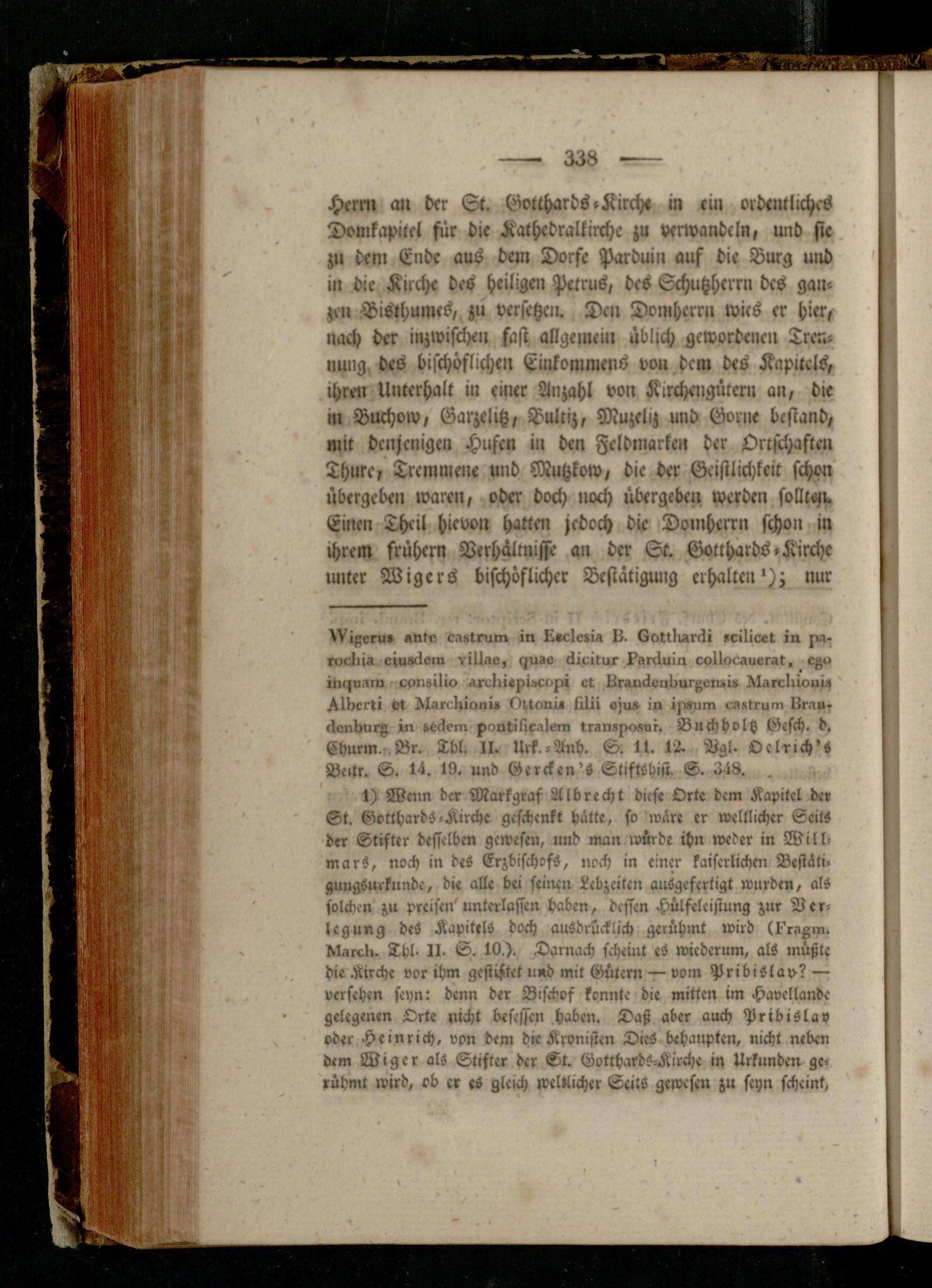 1) Wenn der Markgraf Alb recht diese Orte dem Kapitel der St. Gotthards-Kirche geschenkt hätte, so wäre er weltlicher Seit- der Stifter desselben gewesen, und man würde ihn weder in Will- marS, noch in des Erzbischofs, „och in einer kaiserlichen Bestäti- gungsurkunde, die alle bei seinen Lebzeiten auSgefcrtigt wurden, als solchen zu preisen'unterlassen haben, dessen Hülfeleistung zur Verlegung des Kapitels doch ausdrücklich gerühmt wird (l'r.iß,n. klaren. Thl- II. S. 19). Darnach scheint es wiederum, als müsste hie Kirche vor ihm gestiftet und mit Gütern — vom Pribislav? — versehen seyn: denn der Bischof konnte die mitten im Havellande gelegenen Orte nicht besessen haben. Daß aber auch Pribislav oder Heinrich, von dem die Kfvnisten Dies behaupten, nicht neben dem Wiger als Stifter der St. Gotthards-Kirche in Urkunden gerühmt wird, ob er «S gleich weltlicher SeitS gewesen zu seyn scheint,
