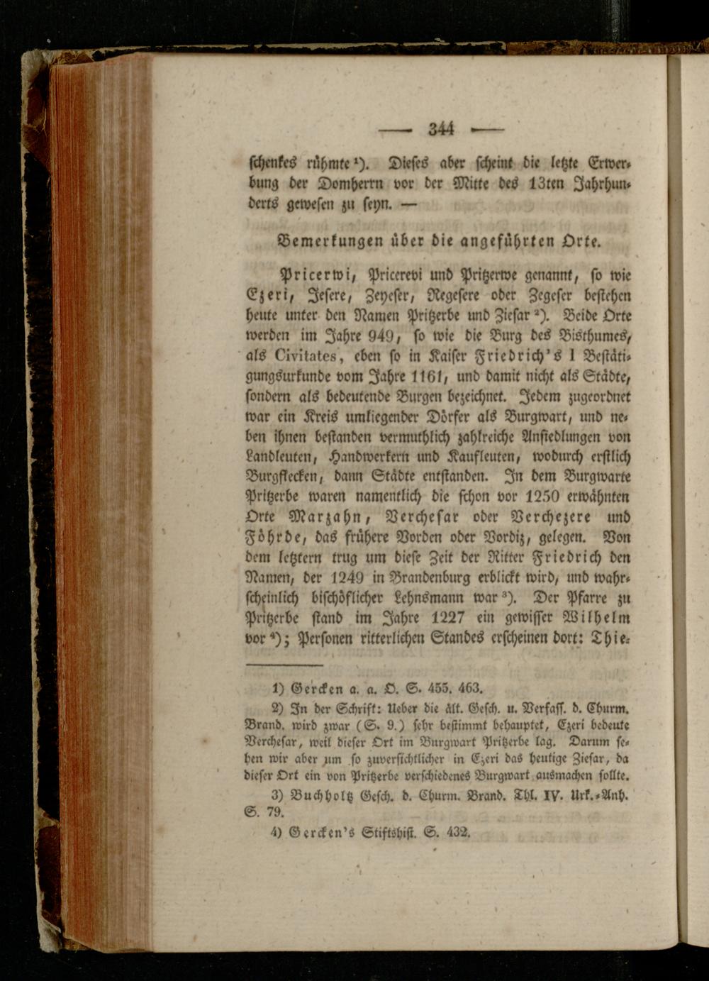 Pricerwi, Priccrevi und Pntzerwe genannt, so wie Czeri, Jesere, Zeycser, Regesere oder Zcgcscr bestehen heute unter den Namen Pritzerbe und Zicsar ^). Beide Orte werben im Jahre 949, so wie die Burg des Bisthumes, als kivitates, eben so in Kaiser Friedrich's I Bcstäti» gungsurkunde vom Jahre 116l, und damit nicht als Städte, sondem als bedeutende Burgen bezeichnet. Jedem zugeordnet war ein Kreis umliegender Dörfer als Burgwart, und ne« ben ihnen bestanden vermuthlich zahlreiche Ansiedlungcn von Landleuten, Handwerkern und Kaufleutcn, wodurch erstlich Burg flecken, bann Städte entstanden. In dem Burgwarte Pritzerbe waren namentlich die schon vor 1250 erwähnten Orte Marzahn, Verchesar oder Verchezere und Föhrbe, das frühere Borden oder Vordiz, gelegen. Von dem letztem trug um diese Zeit der Ritter Friedrich den Namen, der 1249 in Brandenburg erblickt wird, und wahr« scheinlich bischöflicher Lehnsmann war Der Pfarre zu Pritzerbe stand im Jahre 1227 ein gewisser Wilhelm vor*); Personen ritterlichen Standes erscheinen dort: Thie-