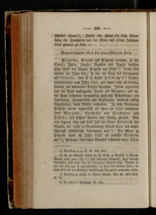 2) In der Schrift: Ueber die ält. Gesch. u. Verfass, d. Churm. Brand, wird zwar (S- 9.) sehr bestimmt behauptet, Ezeri bedeute Verchesar, weil dieser Ort im Burgwart Pritzerbe lag. Darum sehen wir aber -im so zuversichtlicher in Ezeri daS heutige Ziesar, da dieser Ort ein von Pritzerbe verschiedenes Burgwart ausmachen sollte.