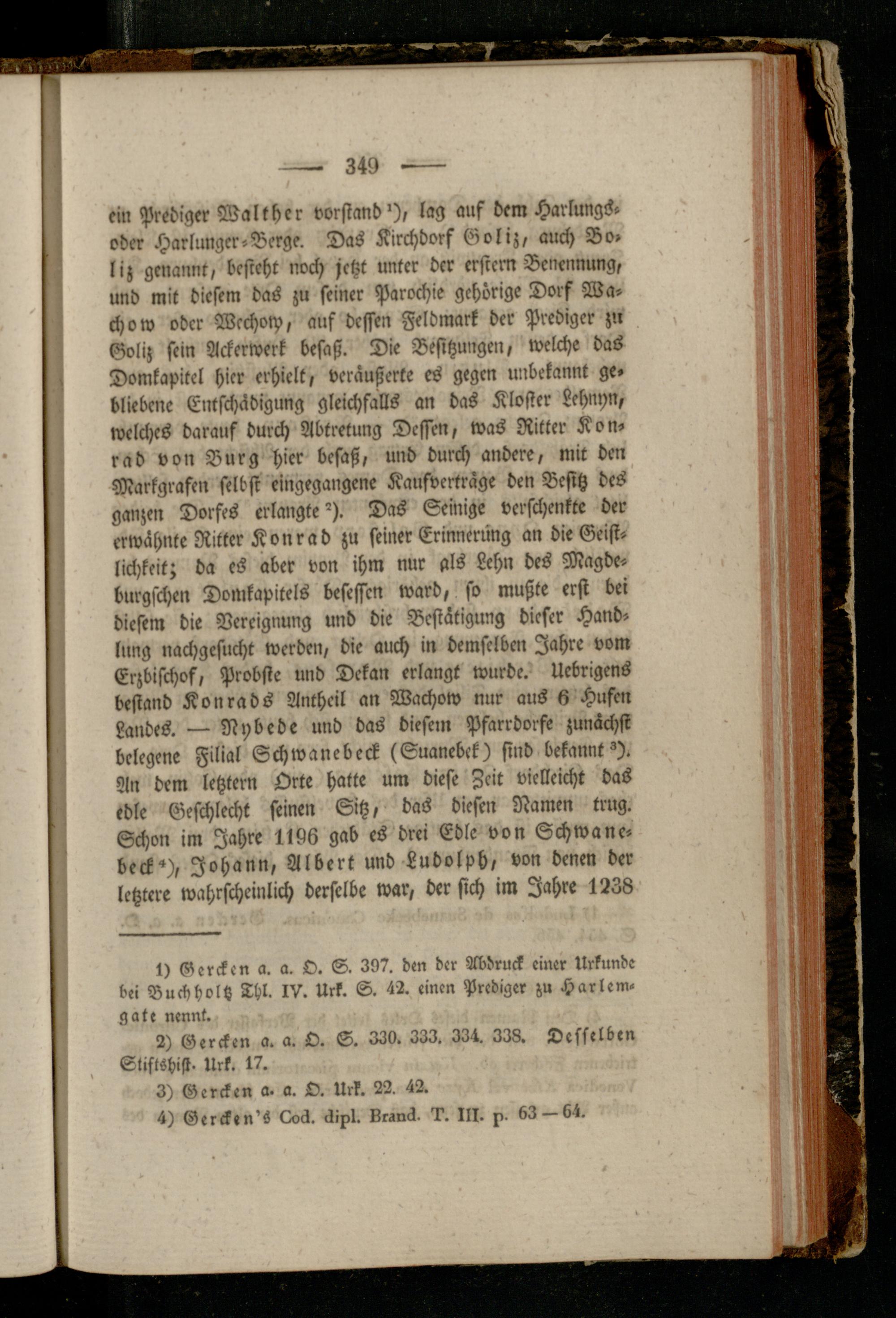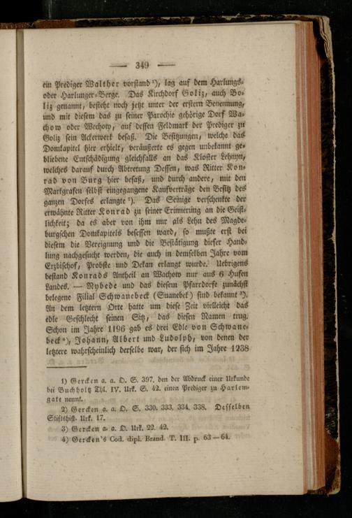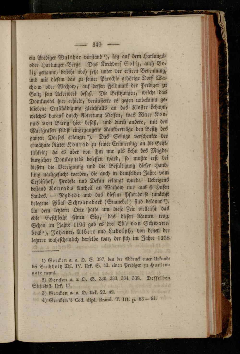 ein Prediger Walther Vorstand'), lag auf dem Harlungs« oder Harlunger-Berge. Das Kirchdorf Goliz, auch Bo» l iz genannt, besieht noch jetzt unter der erstem Benennung, und mit diesem das zu seiner Parochie gehörige Dorf Wa» chow oder Wechoip, auf dessen Feldmark der Prediger zu Goliz sein Ackerwerk besaß. Die Besitzungen, welche das Domkapitel hier erhielt, veräußerte es gegen unbekannt ge» bliebene Entschädigung gleichfalls an das Kloster Lehnyn, welches darauf durch Abtretung Dessen, was Ritter Kon» rad von Burg hier besaß, und durch andere, mit den Markgrafen selbst eingegangene Kaufverträge den Besitz des ganzen Dorfes erlangtes. Das Seinige verschenkte der erwähnte Ritter Kon rad zu seiner Erinnerung an die Geistlichkeit; da es aber von ihm nur als Lehn des Magde- burgschen Domkapitels besessen ward, so mußte erst bei diesem die Vereignung und die Bestätigung dieser Handlung nachgesucht werden, die auch in demselben Jahre vom Erzbischof, Probste und Dekan erlangt wurde. Uebrigens bestand Kon rads Anthcil an Wachow nur aus 6 Hufen Landes. — Nybeöe und das diesem Pfarrdorfe zunächst belegene Filial Schwanebeck (Suanebck) sind bekannt^). An dem letztem Orte hatte um diese Zeit vielleicht das edle Geschlecht seinen Sitz, das diesen Namen trug. Schon im Jahre 1196 gab es drei Edle von Schwane- beck*), Johann, Albert und Ludolph, von denen der letztere wahrscheinlich derselbe war, der sich im Jahre 1238