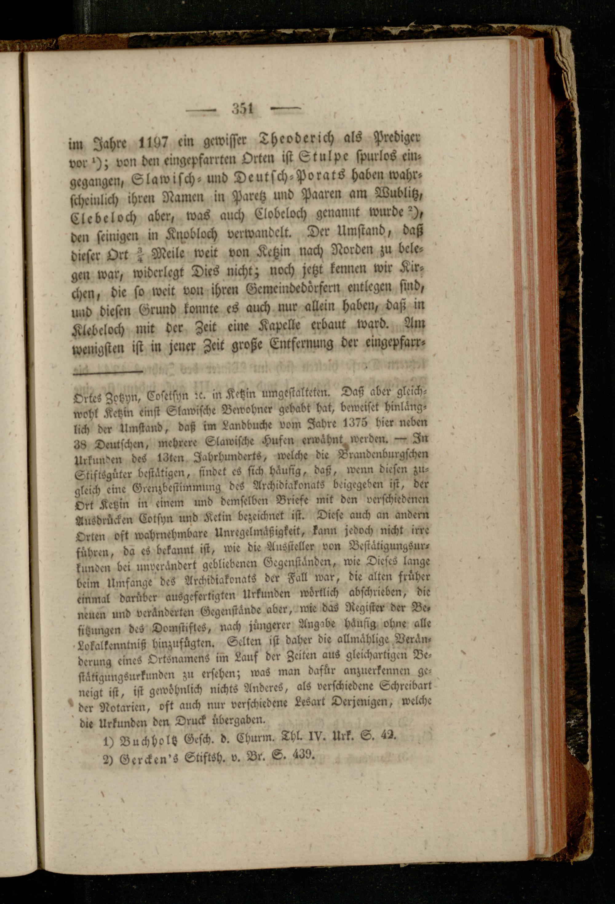 im Jahre 1197 cm gewisser Theoderich als Prediger vor'); von den cingepfarrtc» Orten ist Stulpe spurlos ein- gegangen, Slawisch- und Deutsch-Porats haben wahr» schciullch ihren Namen in Paretz und Paaren am Wublitz, Clebeloch aber, was auch Clobcloch genannt wurdet, den seinigen in Kisvbloch verwandelt. Der Umstand, daß dieser Ort ? Meile weit von Ketzin nach Norden zu belegen war, widerlegt Dies nicht; noch jetzt kennen wir Kirchen, die so weit von ihren Gcmcindedörfern entlegen sind, und diesen Grund konnte es auch nur allein haben, daß in Klebeloch mit der Zeit eine Kapelle erbaut ward. Am wenigsten ist in jener Zeit große Entfernung der eingepfarr»