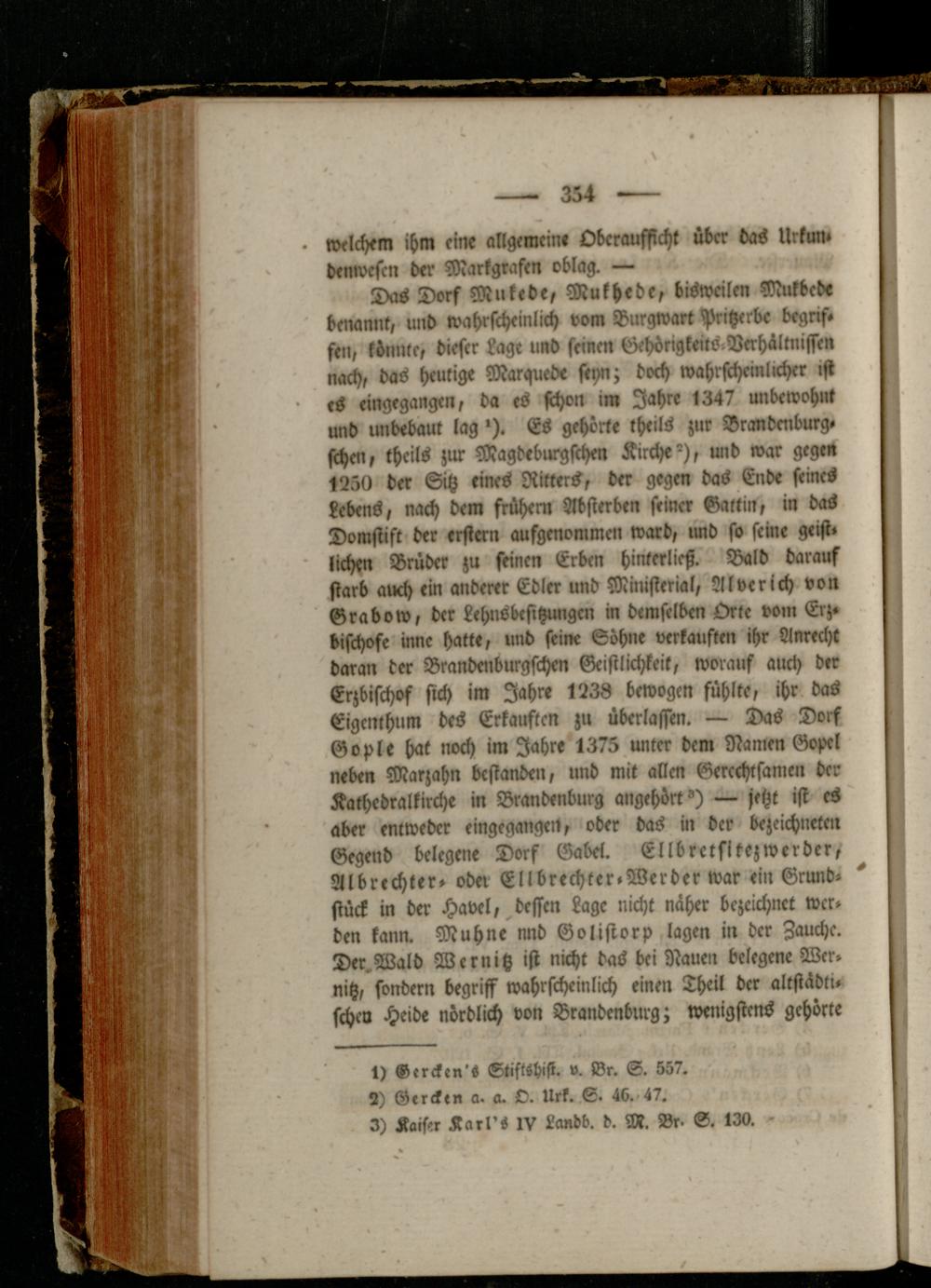 Das Dorf Mukebe, Mukhede, bisweilen Mukbcde benannt, und wahrscheinlich vom Burgwart Pritzerbe begrif, fen, könnte, dieser Lage und seinen Gehörigkeits-Verhältnissen nach, das heutige Marqued« seyn; doch wahrscheinlicher ist es «ingegangen, da es schon im Jahre 1347 unbewohnt und unbebaut lag'). Es gehörte theils zur Brandenburg, schen, theils zur Magdtburgschen Kirche"), und war gegen 1250 der Sitz eines Ritters, der gegen das Ende seines kebens, nach dem frühem Absterbrn seiner Gattin, in das Domstift der erstem ausgenommen ward, rmd so seine geist« liehen Brüder zu seinen Erben hinter liest. Bald darauf starb auch rin anderer Edler und Ministerial, Al der ich von Grabow, der Lehnsbesitzungcn in demselben Orte vom Erz» bischofe inne hatte, und seine Söhne verkauften ihr Anrecht daran der Brandenburgfchen Geistlichkeit, worauf auch der Erzbischof sich im Jahre 1233 bewogen fühlte, ihr das Eigenthum des Erkauften zu überlassen. — Das Dorf Gople hat noch im Jahre 1375 unter dem Namen Göpel neben Marzahn bestanden, und mit allen Gerechtsamen der Kathedralkirche in Brandenburg angehütt") — jetzt ist es aber entweder eingegangen, ober das in der bezeichnet«! Gegend belegen« Dorf Gabel. Ellbretsitezwerder, Albrechter» oder Ellbrechter.Werder war ein Grund« stück in der Havel, dessen Lage nicht näher bezeichnet wer» den kann. Muhne nnd Golistorp lagen in der Zauche. Der.Wald Wernitz ist nicht das bei Nauen belegene Wer. nitz, sondern begriff wahrscheinlich einen Theil der altstädti« scheu Heide nördlich von Brandenburg; wenigstens gehörte
