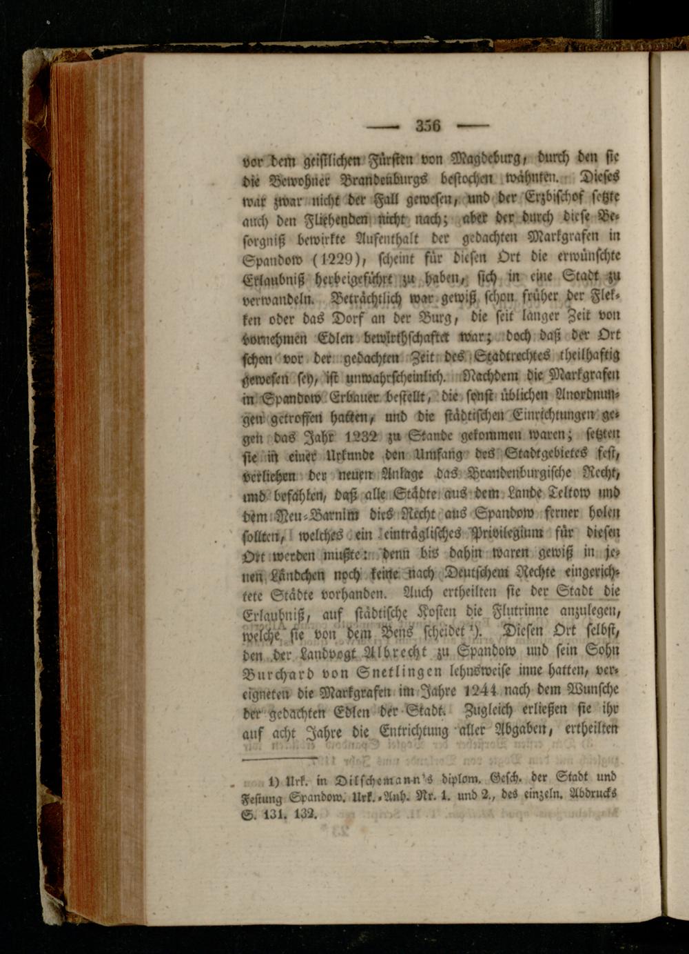 vordem geistlichen Fürsten von Magdeburg, durch den sic di« Bewohner Brandenburgs bestochen wähnttn. Dieses war stvar nicht der Fall gewesen, und der Erzbischof setzte auch den Fliehenden nicht nach; aber der durch dies« Er« sorgniß bewirkte Aufenthalt der gedachten Markgrafen in Spandow (1229), sä-eint für diesen Ott die erwünschte Ekiaubniß herbeigefühtt zu haben, sich in eine Stadt zu verwandeln. Beträchtlich war gewiß schon früher der Flek« ken oder bas Dorf an der Burg, die seit langer Heit von -vmchmen Edlen bewlrthschaster war; doch daß der Ort schm vor der gedachten Zeit, des Sradtreclstes thrilhaftjg gewesen sch, ist unrvahrstheinkich. Nachdem die Markgrafen in Spandow Ertamer bestellt, die sonst üblichen Anordnun» gen getroffen hatten, and die städtischen Einrichtungen ge« geN das Jahr 1232 zu Stande gekommen waren; setzten sie in einer Urkunde den Umfang des Stadtgebietes fest, verliehen dev neuen Anlage das Brandenburgische Recht, »md befählen, daß alle Städte: aus dem Lande Teltow und tstmnDeu-Barnlm dies Recht aus Spandvw ferner holen sollten, welches ein ieinttäglisches ^Privilegium für diesen Ott werben mußte: denn bis dahin waren gewiß in je» ii,n, Ländchen noch keine nach Deutschem Rechte ringerjch» tetc Städte vorhanden. Auch ertheiltcn sie der Stadt die Erlavbniß, auf städtische Kosten die Flutrinne anzulegen, welche sie von dem Bens scheidet'). Diesen Ott selbst, den .der Landvogt Albrecht zu Spandow und sein Sohn Burchard von Snetlingen lchnswcise inne hatten, vcr» eigneten die Markgrafen im Jahre 1241 nach dem Wunsche der gedachten Edlen der Stadt. Zugleich erließen sie ihr auf acht Jahre die Entrichtung aller Abgaben, ettheilten