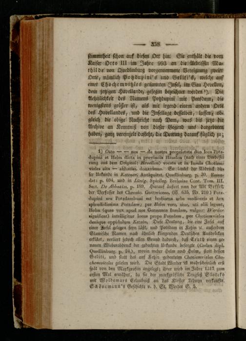 -iguiiiLal) iutelligitur loeu» propa kotrcksm, per Lliotiomvirle» tleuitsus oppiäulum Leeren. Diese Deutung, di« eine Insel auf einer Ansel gelegen seyn läßt, und Potsdam in Ketzin :c, außerdem Slawische Namen nach ähnlich klingenden Deutschen Ausdrücken erklärt, verliert jedoch allen Grund dadurch, daß Erath «inen genauen Wiederabdruck der gedachten Urkunde besorgte (Locken ckipl. <^ueckliniiurz. p. 24.), worin weder Helm noch Holm, statt dessen Gellti, und statt des auf Ketzin gedeuteten Llwtiemvirles L/io- cäemvreL/er gelesen wird. Die Stadt Werder nst wahrscheinlich erst spät von den Markgrafen angelegt; ihrer wird im Jahre 1317 zum ersten Mal erwähnt, da sie der markgräfli'chc Trugseß Slotekd mit Woldemars Erlaubniß an das Kloster Lehnyn verkaufte. Schincmann'S Geschichte v. d. St. Werder S, 5.