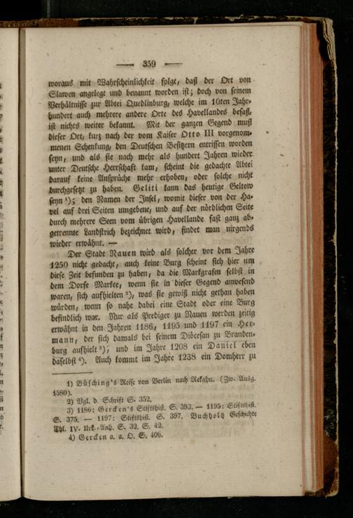 Der Stadt Nauen wird als solcher vor dem Jahre 1250 nicht gedacht, auch keine Burg scheint sich hier um diese Zeit befunden zu haben, da die Markgrafen selbst in dem Dorfe Markee, wenn sie in dieser Gegend anwesend waren, sich aufhielten"), was fie gewiß nicht grthan haben würden, wenn so nahe dabei eine Stadt oder eine Burg befindlich war. Nur als Prediger zu Nauen werden zeitig erwähnt in den Jahren 1186, 1195 und 1197 ein Her» mann, der sich damals bei seinem D-öcesan zu Branden, bürg aufhielt»); und im Jahre 1208 ein Daniel eben daselbst *). Auch kommt im Jahre 1238 ein Domherr zu
