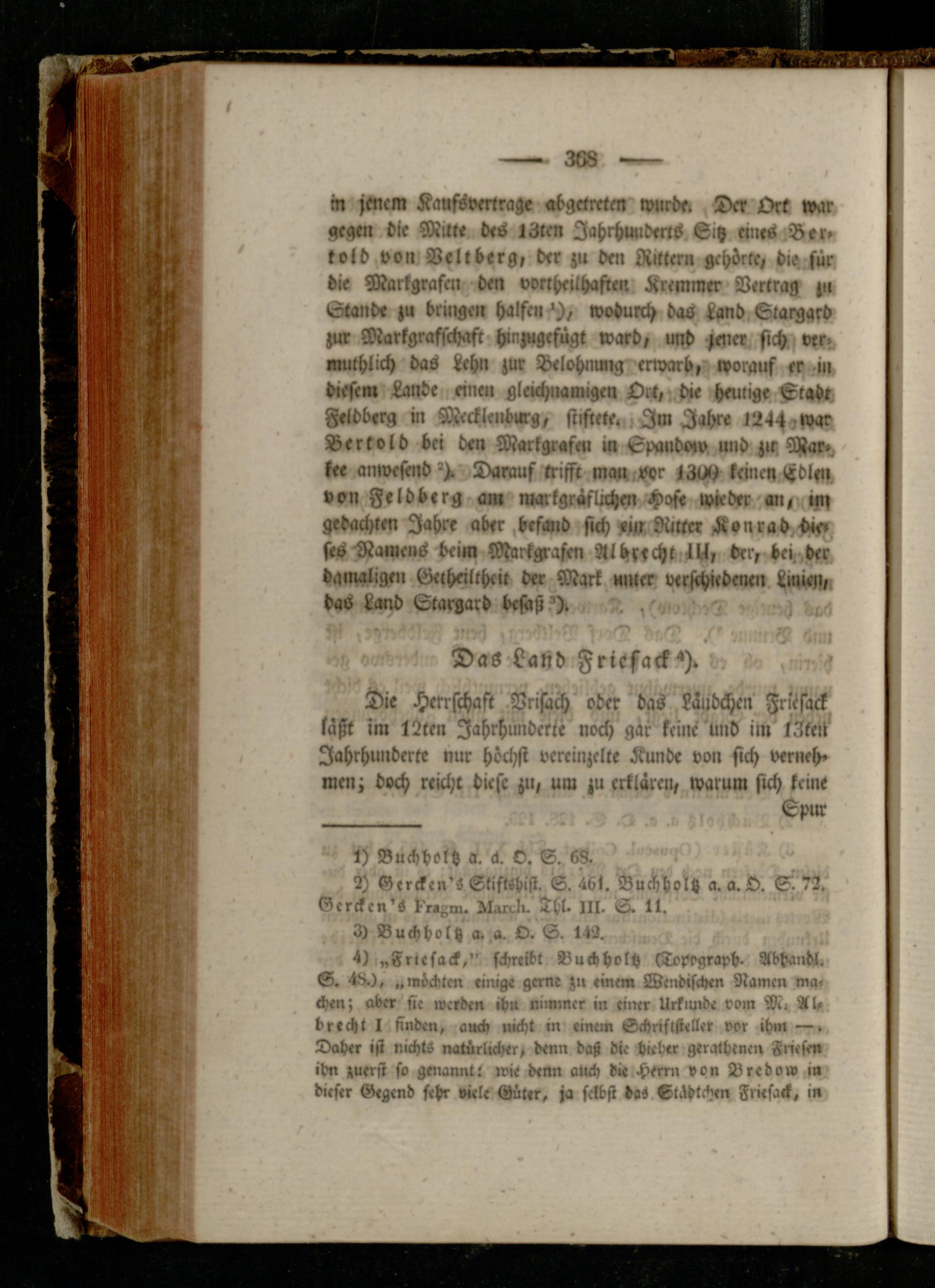 in jenem Kaufsvertrage abgetreten wurde. Der Ork war gegen die Mitte des löten Jahrhunderts Sitz eines Ber» told von Veltberg, derzu den Ritter» gehörte, die für die Markgrafen den vortheithaften Kremmer Vertrag zu Stande zu bringen halfen^), wodurch das Land Stargqrd zur Markgrafschast hinzugefügt ward, und jener sich vrr» muthlich das Lehn zur Belohnung erwarb, worauf er in diesem Lande einen gleichnamigen Ott, die heutige Htadt Feidbrrg in Mecklenburg, stiftete. Im Jahre 12-IH 'war Bertold bei den Markgrafen in Spandoev und zu Markee anwesend^ Darauf trifft man vor 130^ keinen l-blrn von Feldberg am markgräflichen Hoft wieder an, izn gedachten Jahre aber befand sich «m Ritter K»nrad,-d»f» fts Namens beim Markgrafen Aibrecht äll, drr, bei der dainaligen Geiheilthcit der Mark «»tcr verschiedenen Linien,, das Land Stargard besaß .