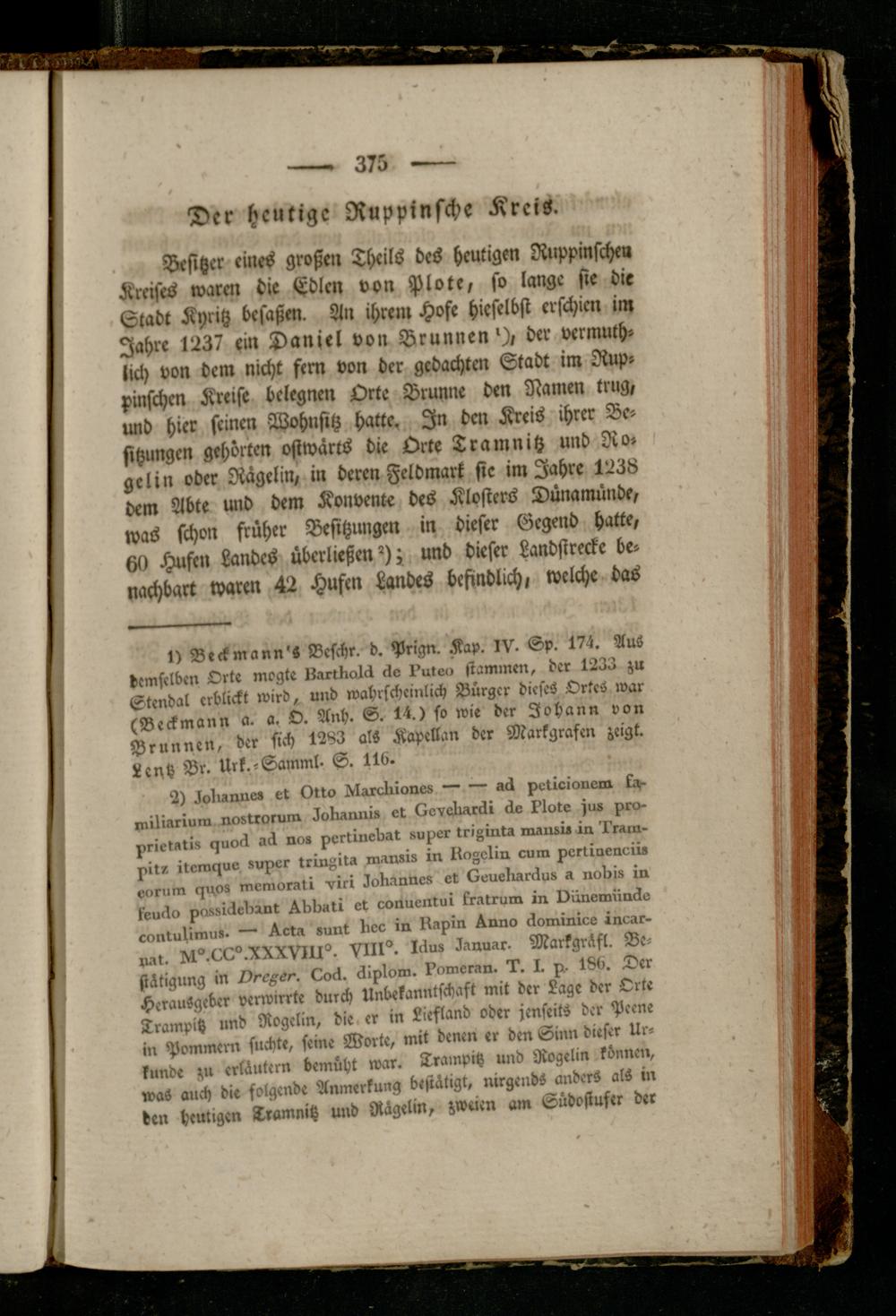 Besitzer eines großeil Thrils des heutigen Ruppinschm Kreises warm die Edlen von Plote, so lange sie die Stadt Kyntz besaßen. An ihrem Hofe hiefelbst erschien im Jahre 1237 ein Daniel von Brunnen^), der vermuth- iich von dem nicht fem von der gedachten Stadt im Rupr pinschen Kreise bclegnen Orte Brunne den Namen trng, und hier seinen Wohnsitz hatte. In dm Kreis ihrer Besitzungen gehörten ostwärts die Orte Tramnitz und Ro» gelin oder Rägelin, in deren Feldmark sic im Jahre 1238 dem Abte und dem Konvente des Klosters Dünamünde, was schon früher Besitzungen in dieser Gegend hatte, 60 Hufen Landes überließen?); und dieser Landsirecke benachbart waren 42 Hufen Landes befindlich, welche das