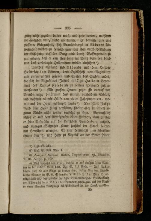 gung nicht gegeben haben muß, und jene darum, nachdem sie geschehen war, nicht anerkannte. Er benutzte also eine passende Gelegenheit, sich Brandenburgs in Albcrts Abwesenheit wieder zu bemächtigen, was ihm durch Bestechung der Besatzung auf der Burg und durch Waffengewalt so gut gelang, daß er eine Zeit lang im Besitz derselben blieb und bas verdrängte Hcidcnkhum wieder einführte').