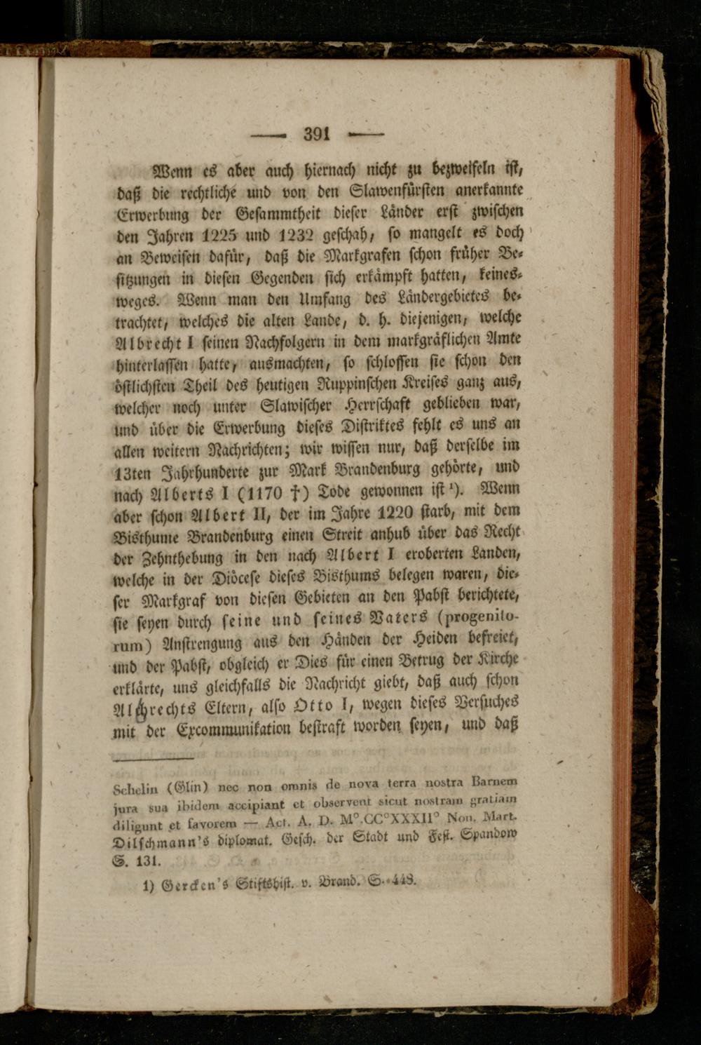 Wenn cs aber auch hiernach nicht zu bezweifeln ist, daß die rechtliche und von den Slawenfürsten anerkannte Erwerbung der Gesammtheit dieser Länder erst zwischen den Jahren 1225 und 1232 geschah, so mangelt es doch an Beweisen dafür, daß die Markgrafen schon früher Besitzungen in diesen Gegenden sich erkämpft hatten, keines- Weges. Wenn man den Umfang des Ländergebictes betrachtet, welches die alten Lande, d. h. diejenigen, welche Al brecht 1 seinen Nachfolgern in dem markgräflichcn Amte hinterlassen hatte, ausmachten, so schloffen sie schon den östlichsten Theil des heutigen Ruppinschen Kreises ganz aus, welcher noch unter Slawischer Herrschaft geblieben war, lind über die Erwerbung dieses Distriktes fehlt cs uns an allen weitern Nachrichten; wir wissen nur, daß derselbe im 13ten Jahrhunderte zur Mark Brandenburg gehörte, und nach Alberts I (1170 f) Tode gewonnen ist'). Wenn aber schon Albert H, der im Jahre 1220 starb, mit dem Bisthume Brandenburg einen Streit anhub über das Recht der Zehnthebung in den nach Albert I eroberten Landen, welche in der Diöcese dieses Bisthums belegen waren, dieser Markgraf von diesen Gebieten an den Pabst berichtete, sie seyen durch seine und seines Vaters (prvFenilu- ium) Anstrengung aus den Händen der Heiden befreiet, »md der Pabst, obgleich er Dies für einen Betrug der Kirche erklärte, uns gleichfalls die Nachricht giebt, daß auch schon Anrechts Eltern, also Otto l, wegen dieses Versuches mit der Epcommunlkation bestraft worden seyen, und daß