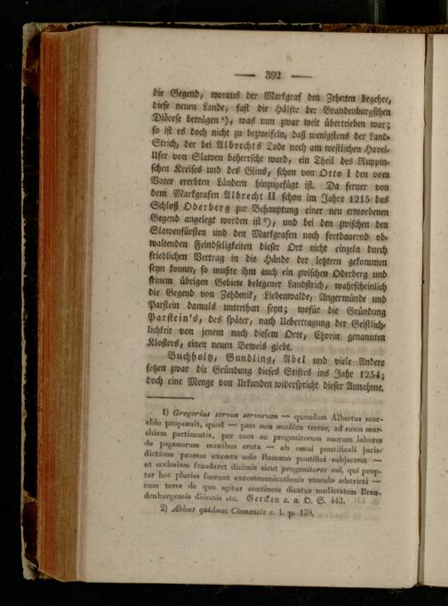 dir Gegend, woraus der Markgraf den Zehnten begehre, diese neuen Lande, fast die Hälfte der Brandenburgschen Diöcese betrügen'), was nun zwar weit übertrieben war; so ist es doch nicht zu bezweifeln, daß wenigstens der Land« Strich, der bei Al brecht s Tode noch am westlichen Havel» Ufer von Slawen beherrscht ward, ein Theil des Ruppin» scheu Kreises und des Glins, schon von Otto I den vom Vater ererbten Landern hinzugefügt ist. Da ferner von dem Markgrafen Al brecht H schon im Jahre 1215 das Schloß Oderberg zur Behauptung einer neu erworbenen Gegend angelegt worden ist»), und bei den zwischen den Slawenfürstrn und dm Markgrafen noch fortdauernd ob« waltenden Feindseligkeiten biestr Ort nicht einzeln durch friedlichen Vertrag in die Hände der letztem gekommen seyn konnte, so mußte ihm auch ein zwischen Oderberg und stinem übrigen Gebiete belegcncr Landstrich, wahrscheinlich die Gegend von Zehdrnik, Liebenwalde, Angermünde und Parstein damals unterthan seyn; wofür die Gründung Parstein's, des später, nach Uebertragung der Geistlich» lichkeit von jenem nach diesem Orte, Chorin genannten Klosters, einen neuen Beweis giebt.