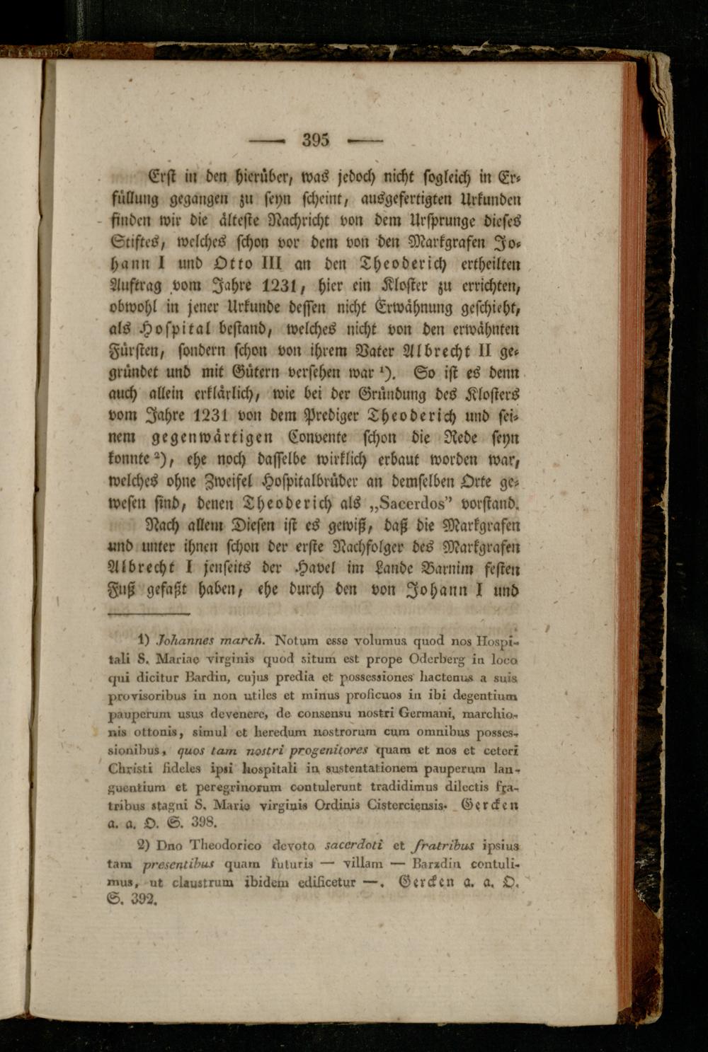 Erst in den hierüber, was jedoch nicht sogleich in Erfüllung gegangen zu seyn scheint, ausgefertigten Urkunden - finden wir die älteste Nachricht von dem Ursprünge dieses Stiftes, welches schon vor dem von den Markgrafen Johann I und Otto III an den Theoderich ertheilten Auftrag vom Jahre 1231, hier ein Kloster zu errichten, obwohl in jener Urkunde dessen nicht Erwähnung geschieht, als Hospital bestand, welches nicht von den erwähnten Fürsten, sondern schon von ihrem Vater Albrecht H gegründet und mit Gütern versehen war'). So ist es denn auch allein erklärlich, wie bei der Gründung des Klosters vom Jahre 1231 von dem Prediger Theoderich und seinem gegenwärtigen Convente schon die Rede seyn konnte *), ehe noch dasselbe wirklich erbaut worden war, welches ohne Zweifel Hospitalbrüder an demselben Orte gewesen sind, denen Theoderich als „Ssceräos" Vorstand.