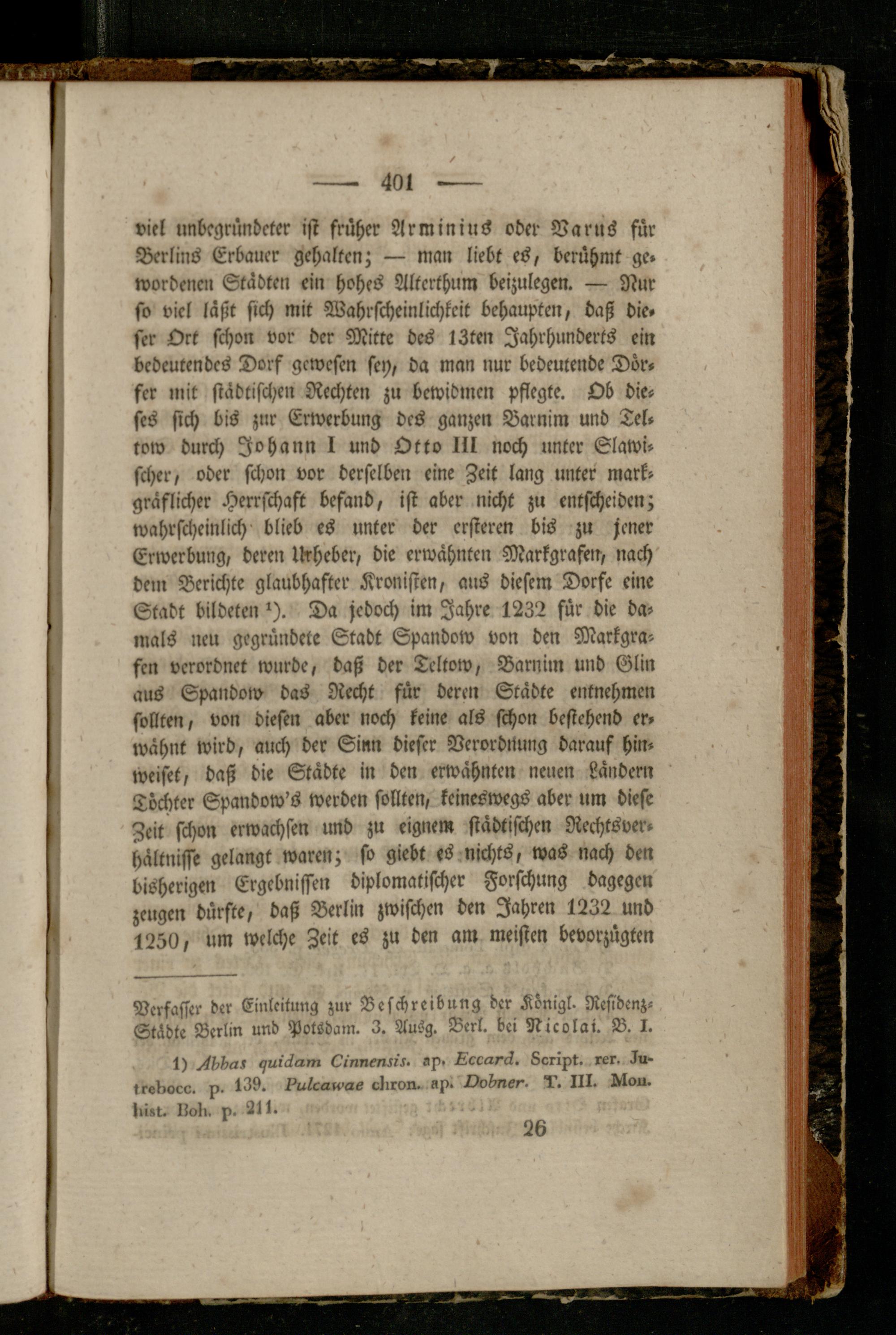 viel unbegründeter ist früher Arminius oder Varus für Berlins Erbauer gehalten; — man liebt es, berühmt ge. wordenen Städten ein hohes Altcrthum beizulegen. — Nur so viel laßt sich mit Wahrscheinlichkeit behaupten, baß die» scr Ort schon vor der Mitte des IZten Jahrhunderts ein bedeutendes Dorf gewesen sei), da man nur bedeutende Dör. scr mit städtischen Rechten zu bewidmen pflegte. Ob dieses sich bis znr Erwerbung des ganzen Barnim und Teltow durch Johann I und Otto 111 noch unter Slawischer, oder schon vor derselben eine Zeit lang unter markgräflicher Herrschaft befand, ist aber nicht zu entscheiden; wahrscheinlich blieb es unter der crsteren bis zu jener Erwerbung, deren lkheber, die erwähnten Markgrafen, nach dem Berichte glaubhafter Kronisten, aus diesem Dorfe eine Stadt bildeten ^). Da jedoch im Jahre 1232 für die damals neu gegründete Stadt Spandow von den Markgrafen verordnet wurde, daß der Teltow, Barnim und Glin aus Spandow das Recht für deren Städte entnehmen sollten, von diesen aber noch keine als schon bestehend erwähnt wird, auch der Sinn dieser Verordnung darauf hinweiset, daß die Städte in den erwähnten neuen Ländern Töchter Spandow's werden sollten, keineswegs aber um diese Zeit schon erwachsen und zu eignem städtischen Rechtsverhältnisse gelangt waren; so giebt es nichts, was nach den bisherigen Ergebnissen diplomatischer Forschung dagegen zeugen dürfte, daß Berlin zwischen den Jahren 1232 und 1250, um welche Zeit es zu den am meisten bevorzügten