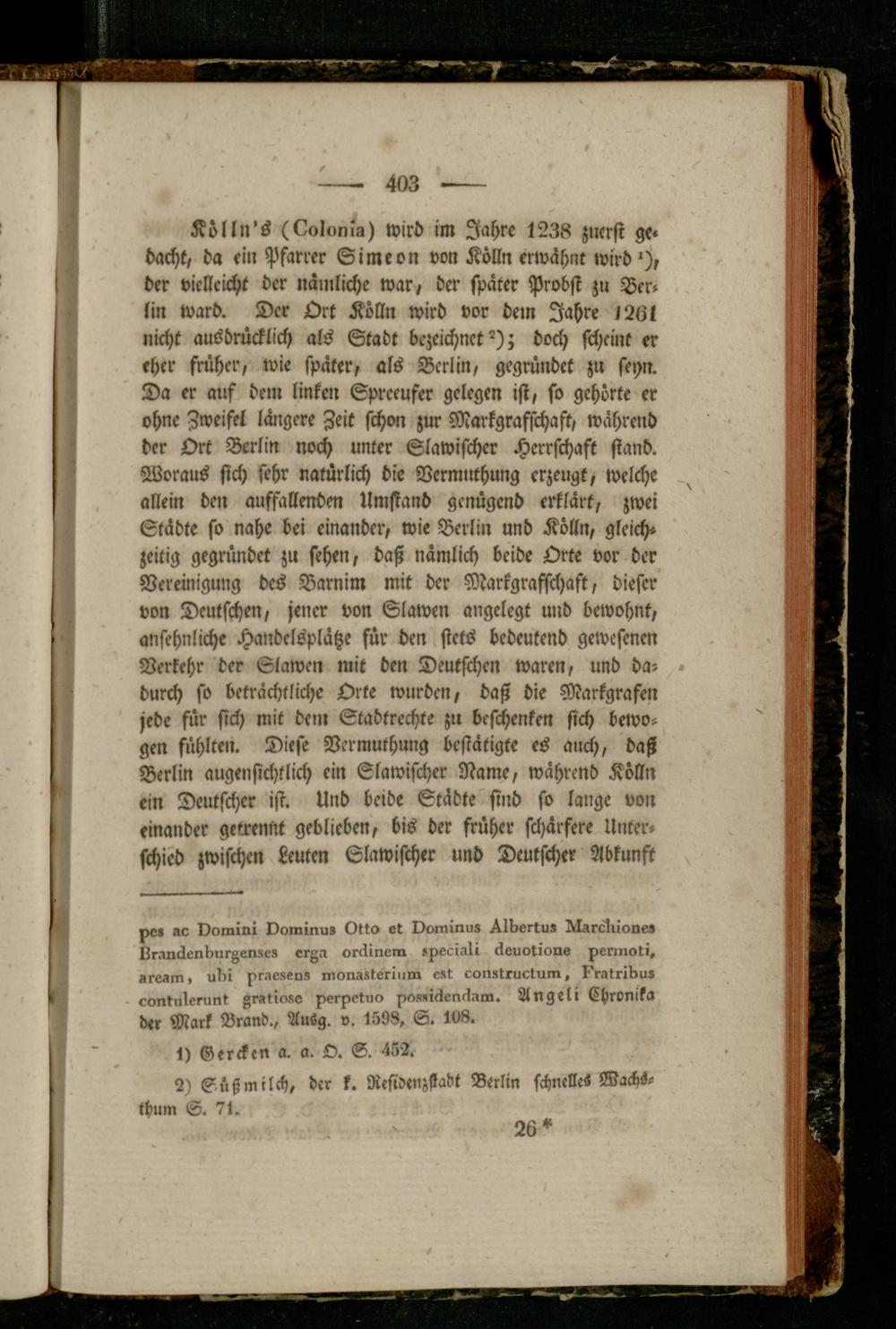 Kölln's (6oI«n ls) wird im Jahre 1238 zuerst ge« dacht, da ein Pfarrer Simeon von Kölln erwähnt wird'), der vielleicht der nämliche war, der später Probst zu Ber- lin ward. Der Ort Kölln wird vor dein Jahre 1261 nicht ausdrücklich als Stadt bezeichnet*); doch scheint er eher früher, wie später, als Berlin, gegründet zu seyn. Da er auf dem linken Sprceufer gelegen ist, so gehörte er ohne Zweifel längere Zeit schon zur Markgraffchaft, während der Ort Berlin noch unter Slawischer Herrschaft stand. Woraus sich sehr natürlich die Vermuthung erzeugt, welche allein den auffallenden Umstand genügend erklärt, zwei Städte so nahe bei einander, wie Berlin und Kölln, gleich« zeitig gegründet zu sehen, daß nämlich beide Orte vor der Vereinigung des Barnim mit der Markgrafschaft, dieser von Deutschen, jener von Slawen angelegt und bewohnt, ansehnliche Handelsplätze für den stets bedeutend gewesenen Verkehr der Slawen mit den Deutschen waren, und da- . durch so beträchtliche Orte wurden, daß die Markgrafen jede für sich mit den« Stadtrechte zu beschenken sich bewogen fühlten. Diese Vermuthung bestätigte es auch, daß Berlin augensichtlich ein Slawischer Name, während Kölln ein Deutscher ist. Und beide Städte sind so lange von einander getrennt geblieben, bis der früher schärfere Unterschied zwischen Leuten Slawischer und Deutscher Abkunft