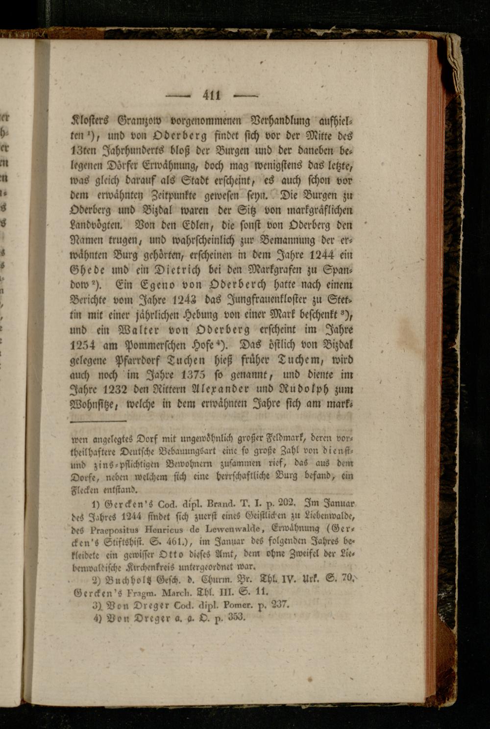 Klosters Gramzow vorgmommenm Verhandlung aufhielten'), und von Oderb erg findet sich vor der Mitte des 13ken Jahrhunderts bloß der Burgen und der daneben be- legencn Dörfer Erwähnung, doch mag wenigstens das letzte, was gleich darauf als Stadt erscheint, es auch schon vor dem erwähnten Zeitpunkte gewesen seyn. Die Burgen zu Oderberg und Bizdal waren der Sitz von markgräflichen Landvögten. Von den Edlen, die sonst von Oderberg den ' Namen trugen, und wahrscheinlich zur Bemannung der erwähnten Burg gehörten, erscheinen in dem Jahre 1244 ein Ghede und ein Dietrich bei den Markgrafen zu Span- dow'). Ein Egcno von Oderberch hatte nach einem Berichte vom Jahre 1243 das Jungfrauenkloster zu Stettin mit einer jährlichen Hebung von einer Mark beschenkt«), und ein Walter von Oderbrrg erscheint im Jahre 1254 am Pommcrschen Hofe*). Das östlich von Bizdal gelegene Pfarrdorf Tuchen hieß früher Tuchem, wird auch noch im Jahre 1375 so genannt, und diente im Jahre 1232 den Rittern Alexander und Rudolph zum Wohnsitze, welche in dem erwähnten Jahre sich am mark-