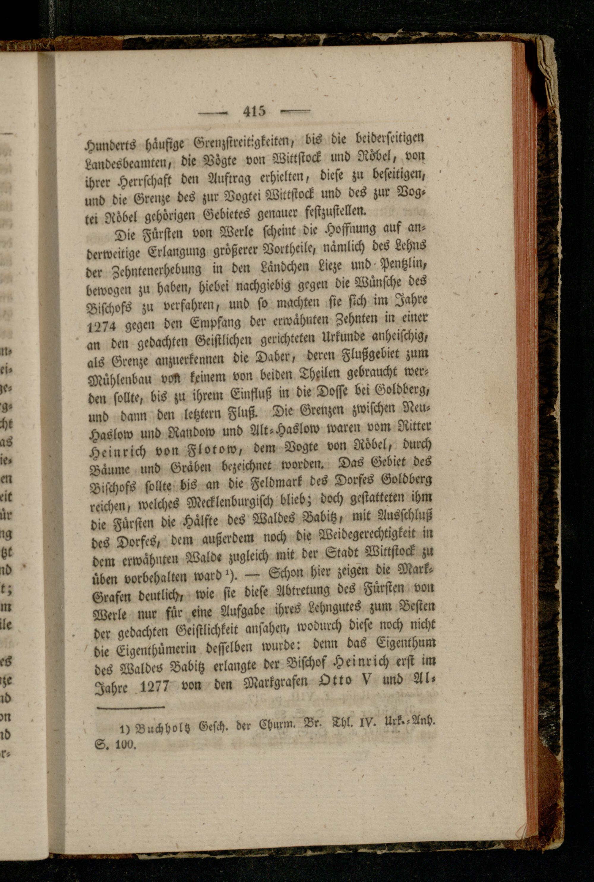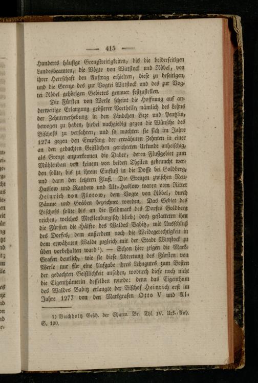 Die Fürsten von Werle scheint die Hoffnung auf anderweitige Erlangung größerer Vortheile, nämlich des Lehns der Zchntenerhebung in den Ländchen Lieze und Pentzlin, bewogen zu haben, hiebei nachgiebig gegen die Wünsche des Bischofs zu verfahren, und so machten sie sich im Jahre 1274 gegen den Empfang der erwähnten Zehnten in einer an den gedachten Geistlichen gerichteten Urkunde anheischig, als Grenze anznerkennen die Daber, deren Flußgebiet zum Mühlenbau vM keinem von beiden Thxilen gebraucht werden sollte, bis zu ihrem Einfluß in die Doffe bei Goldberg, und dann den letzter» Fluß. Die Grenzen zwischen Neu- Haslow und Randow und Alt-Haslow waren vom Ritter Heinrich von Flotow, dem Vogte von Röbel, durch Bäume und Graben bezeichnet worden. Das Gebiet des Bischofs sollte bis an die Feldmark des Dorfes Goldberg reichen, welches Mecklenburgisch blieb; doch gestatteten ihm die Fürsten die Hälfte des Waldes Babitz, mit Ausschluß des Dorfes, dem außerdem noch die Weidegerechtigkeit in dem erwähnten Walde zugleich mit der Stadt Wittstock zu üben Vorbehalten ward *). — Schon hier zeigen die Mark- Grafen deutlich, wie sie diese Abtretung des Fürsten von Werle nur für eine Aufgabe ihres Lehngutes zum Besten der gedachten Geistlichkeit ansahen, wodurch diese noch nicht die Eigenthümerin desselben wurde: denn das Eigenthum des Waldes Babitz erlangte der Bischof Heinrich erst im Jahre 1277 von den Markgrafen Otto V und Al-