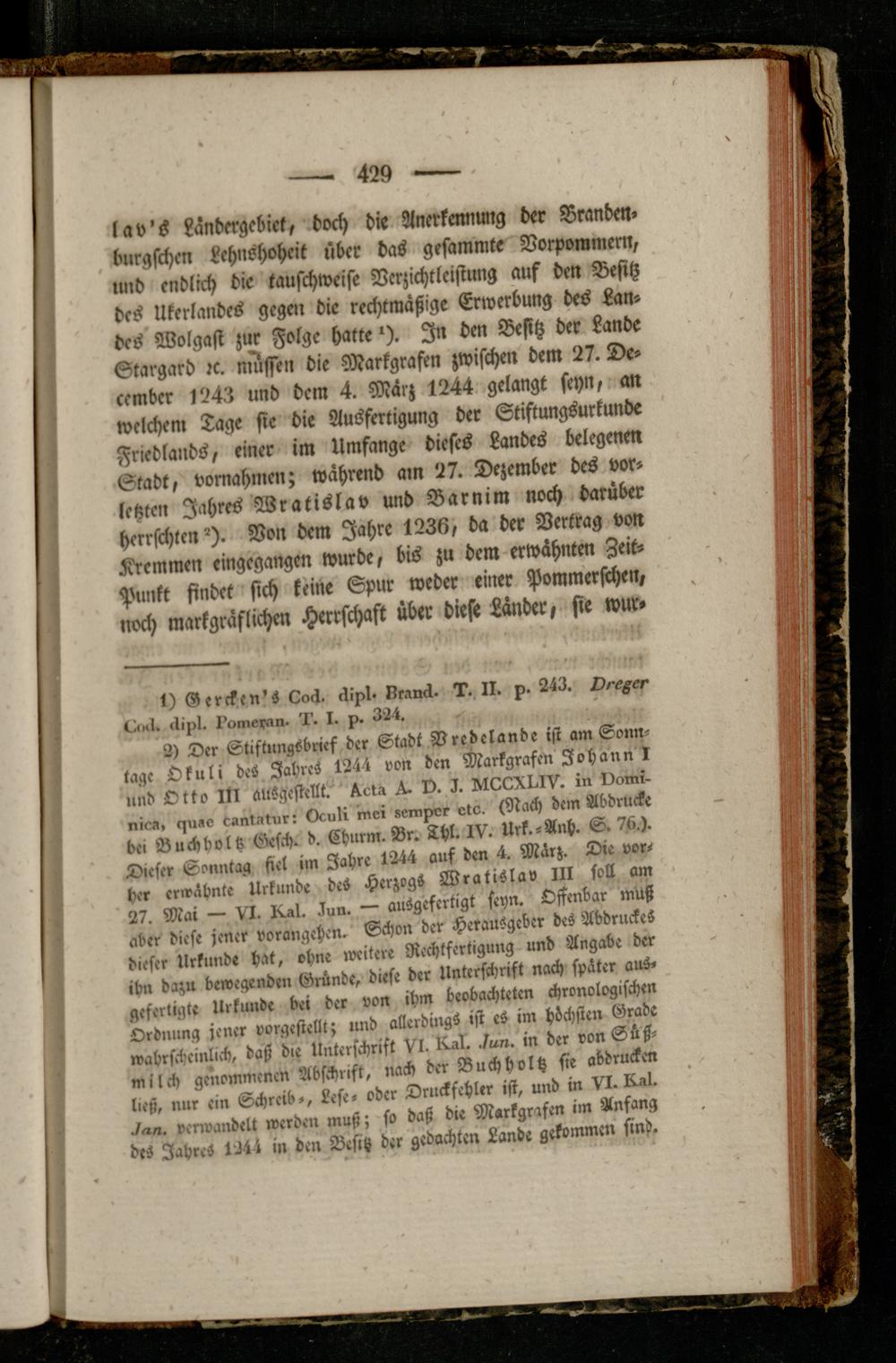 lav's Länbergebiel, doch die Anerkennung der Branden» burgschcn Lehnshoheit über bas gesammte Vorpommern, lind endlich die tauschweise Verzichtleistung auf den Besitz des Ukerlaudes gegen die rechtmäßige Erwerbung des Landes Wolgast zur Folge hatte'). In dm Besitz der Lande Gtargard rc. müssen die Markgrafen zwischen dem 27. De- cember 1243 und dem 4. März 1244 gelangt seyn, an welchenr Tage sie die Ausfertigung der Stiftungsurkunde Friedlands, einer im Umfange dieses Landes belegenm Stadt, Vornahmen; während am 27. Dezember des vorletzten Jahres Wratislav und Barnim noch darüber herrschten 2 ). Von dem Jahre 1236, da der Vertrag von Kremmen eingegangen wurde, bis zu dem erwähntm Zeit- Punkt findet sich keine Spur weder einer Pommerfthen, noch markgräflichen Herrschaft über diese Länder, sie wur»