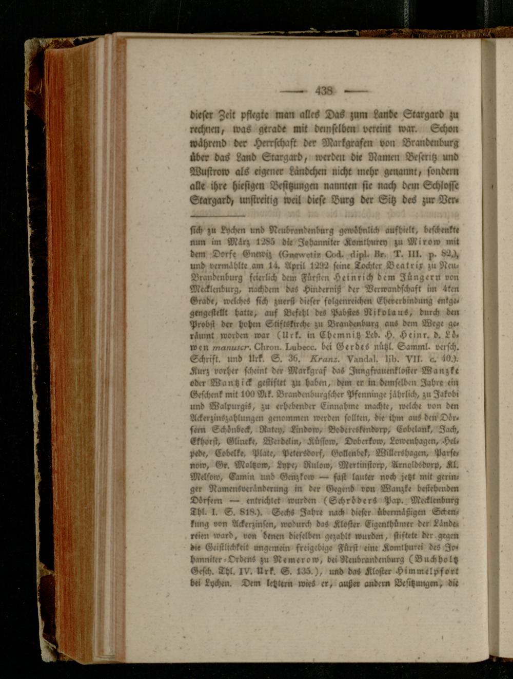 sich zu knchen und Neubrandenburg gewöhnlich aufhielt, beschenkt« nun im März 1285 dt« Iihanniter Komthurey zu Mirow mit dem Dorf« Grxwez <6»»«etiv Lest- elipl. Nr. 1. lll. 82,), und vermöhlt« am 14. April 1282 seine Tochter Beatrix zu Neu- Brandenburg feierlich dem Fürsten Heinrich dem Jüngern von Mecklenburg, nachdem das Hinderniß der Verwandschaft im 4len Krad«, welches sich zuerst dieser folgenreichen kbtverdindung «ntg«. gtngcstellt hatte, auf Befehl d«S 'pabßeS Nikolaus, durch den Probst der hohen Stiftskirche zu Brandenburg au» dem Wege geräumt worden war (Urk. in Chemnitz Leb. H. Heinr. d. Löwen manurcn. Lliron. l-ubecc. bei GerdtS nützl. Sanunl. verfch. Schrift, und llrk. S. 36. /tr-anr. Vsiulal. lib. VII- o. 10.). Kurz vorher scheint der Markgraf daS Jnngfrauenkloster Wanzke oder Wantzick gestiftet zu haben, dem er in demselben Jahre «!>, Geschenk mit 100 Mk. Brandenburgscher Pfenning« jährlich, zu Jakobi und WalpurgiS, zu erhebender Einnahme machte, welch« von den AckerzinSzahlungen genommen werden sollten, die ihm auS den Dörfern Echönbeck, Ratey, Lindow, BodercSkendorp, Eobelank, Jach, Ekborst, Gliiuk«, Werbelin, Küssow, Doberkow, Lowenhagen, Hel. pede, Cobelk», Plate, PetrrSdorf, Goklenbek, WillcrShagen, Pars», now, Gr. Moltzow, Lyp«, Liulow, Mertmftorp, Arnoldsdvrp, Kl. Melsow, Gamin und Genzkow — fast lauter noch jetzt mit geringer NamtnSveränderung in der Gegend von Wanzke bestehenden Dörfern — entrichtet wurden (Schröders Pap. Mecklenburg Thl. !. S. 818.). Sechs Jahre nach dieser übermäßigen Schenkung von Ackerzinsm, wodurch das Kloster Eigenthümer der Ländereien ward, von denen dieselben gezahlt wurden, stiftete der Kegen di« Geistlichkeit ungemein freigebig« Fürst eine Komihurei des Johanniter-Ordens zu Nemerow, bei Neubrandenburg (Buchholtz Gesch. Thl. IV. Urk. S. 135 ), und daS Kloster Himmtlpfort bei Lychen. D«m letzt«rn wi«S er, außer andern Böschungen, -i«