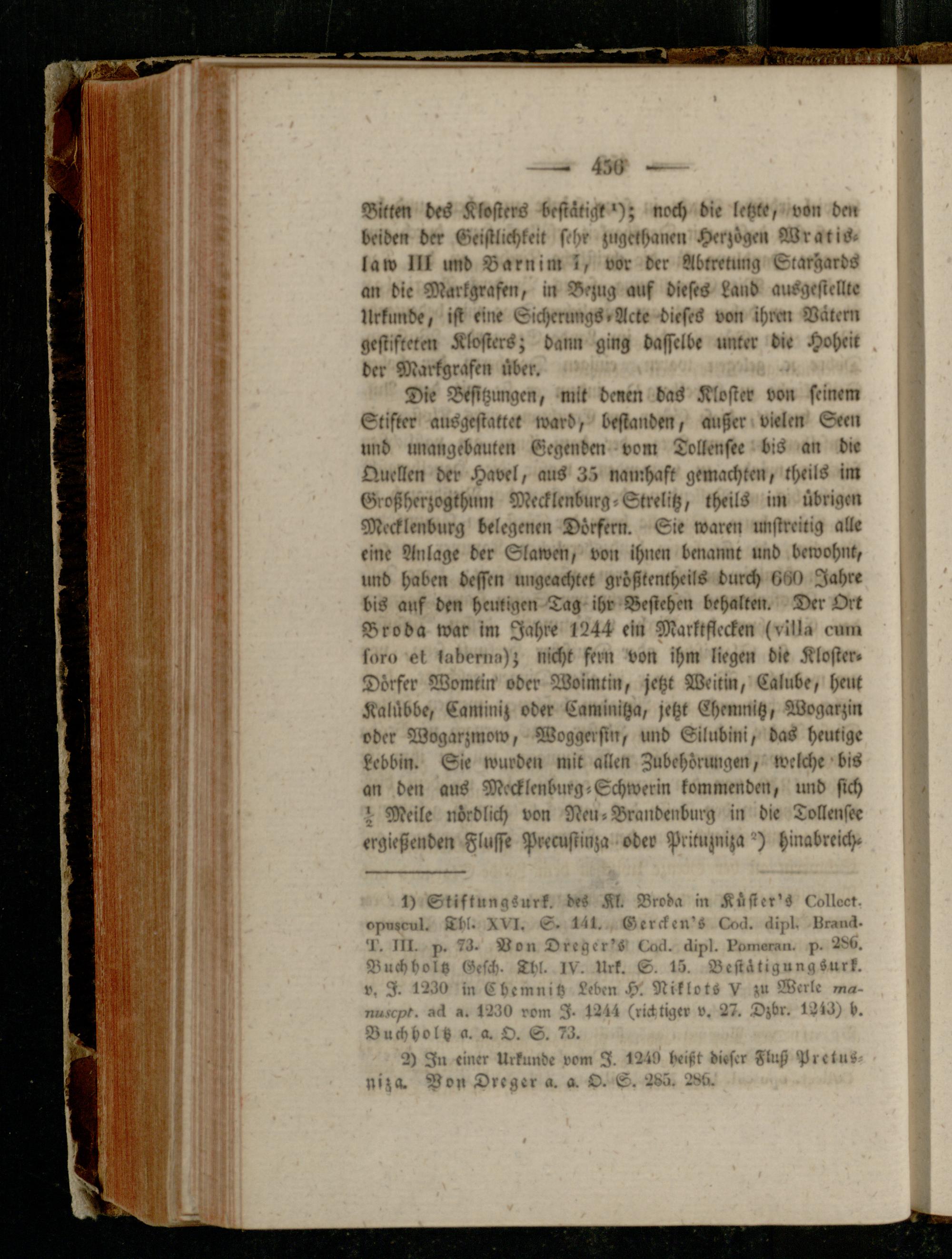 Die Besitzungen, mit denen bas Kloster von seinem Stifter ausgestattet ward, bestanden, außer vielen Seen und unangebauten Gegenden vom Tollensee bis an die Quellen der Havel, aus 3.» namhaft gemachten, theils im Großherzogthum Mecklenburg. Etrelitz, theils im übrigen Mecklenburg belegenen Dörfern. Eie warm unstreitig alle eine Anlage der Slawm, von ihnen benannt und bewohnt, und haben dessen ungeachtet größtenteils durch 660 Jahre bis auf den heutigen Tag ihr Bestehen behalten. Der Ort Broda war im Jahre 1244 ein Marktflecken (villa c-mn s,»r<» et laben,!,); nicht fern von ihm liegen die Kloster» Dörfer Womtin oder Woimtin, jetzt Weitin, Calube, Hern Kalübbe, Caminiz oder Caminitza, jetzt Chemnitz, Wogarzin oder Wogarzmow, Woggersin, und Siludini, bas heutige kebbin. Sie wurden mit allen Zubehörungen, welche bis an den aus Mecklenburg-Schwerin kommenden, und sich 2 Meile nördlich von Neu. Brandenburg in die Tollensec ergießenden Flusse Prccustinza ober Prituzniza °) hinabrrich»