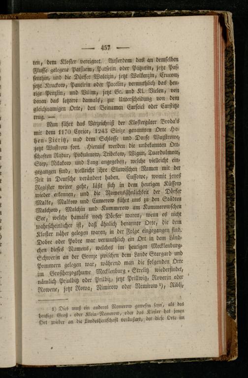 Nun führt das Verzeichnst der Klostergütcr Broda's mit dem 1170 Cyrice, 1243 Sirizc genannten Orte Hohen-Zieritz, und dem Schlosse und Dorfe Wuzsirowe, jetzt Wustrow fort. Hierauf werden die unbekannten Ortschaften Radur, Podulmow, Tribekow, Wigun, Tuardulmow, Step, Nikakow und Lang angegeben, welche vielleicht ein- gegangcn sind, vielleicht ihre Slawischen Namen mit der Zeit in Deutsche verändert haben. Cussowc, womit jenes Register weiter geht, läßt sich in dem heutigen Küssow wieder erkennen, und die Namensahnlichkeit der Dörfer Malke, Malkow und Cumerow führt uns zu den Städten Malchow, Malchin und Kummerow am Kummerowfchcn See, welche damals noch Dörfer waren, wenn es nicht wahrscheinlicher ist, daß ähnlich benannte Orte, hie dem Kloster näher gelegen waren, in der Folge eingegangen sind. Dobre oder Pobre war vcrmuthlich ein Ort in dem Lünd- chen dieses Namens, welches im heutigen Mecklenburg- Schwerin an der Grenze zwischen dem Lande Stargard und Pommern gelegen war, während man die folgenden Orte im Großherzogthume Mecklenburg - Strclitz wiederfindet, nämlich Priulbitz oder Prilbiz, jetzt Prillwitz, Roverin oder ' Rowene, jetzt Rowa, Nimirow oder Neinirow'), Ribki,