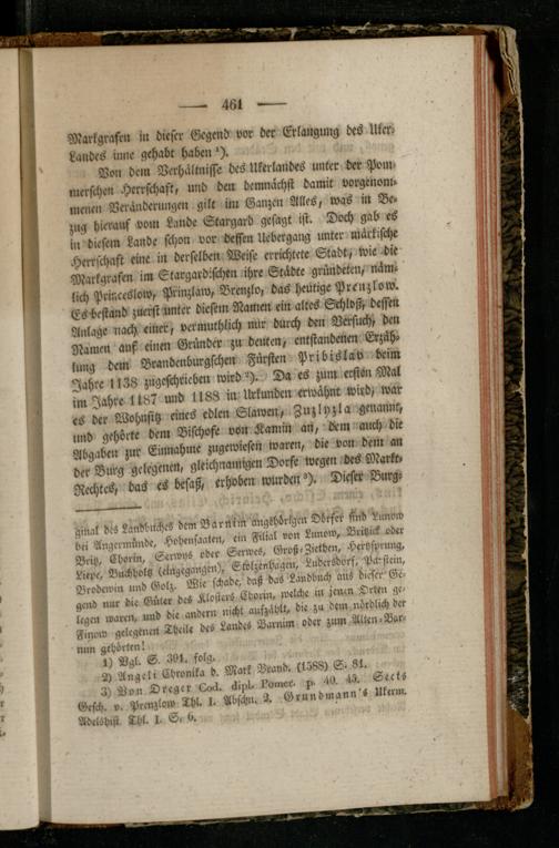 Von dem Verhältnisse des Ukerlairbrs unter der Pom- nierfchcn Herrschaft, und den demnächst damit Vorgenom- menen Veränderungen gilt im Ganzen Alles, was in Bezug hierauf von, Lande Stargard gesagt ist. Doch gab es in diesem Lande schon vor dessen UebergaiD unter märkische Herrschaft eine in derselben Weise errichtete Stadt, wie die Markgrafen im Stargardischen ihre Städte gründeten, nämlich Prir.ccslow, Prinzlaw, Brenzlo, das heutige Prenzlow. Es-bestand zuerst unter diesem Namen ein altes Schloss, dessen Anlage nach einer, vermuthlich nur durch den Versuch, den Namen auf einen Gründer zu deuten, entstandenen Erzählung dem Brandcnburgschen Fürsten Pribislav beim Jahre 1138 zngeschricbm wird H. Da es zum ersten Mal im Jahre 1187 und 1188 in Urkunden erwähnt wird- war es der Wohnsitz eines edlen Slawen, Zuzlyzla genannt, und gehörte dem Bischöfe von Kamm an, dem auch die Abgaben zur Einnahme zugewicstn waren, die von dein an der Burg gelegenen, gleichnamigen Dorfe wegen des Markt- Rechtes, das es besaß, erhoben wurden H. Dieser Burg»