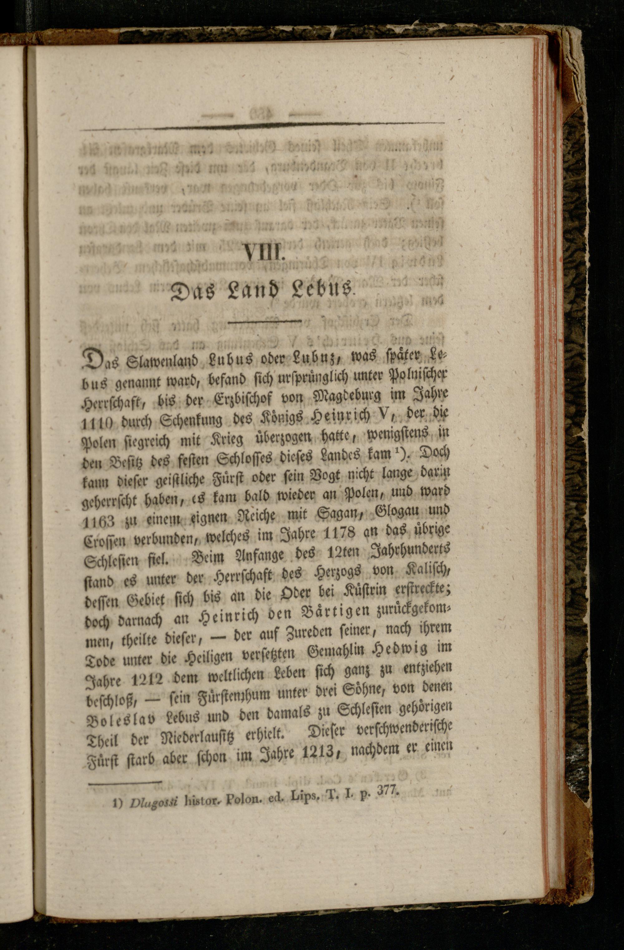 Das Slawenlaud Lubus oder Lubuz, was später Letz us Mannt ward, befand sich ursprünglich unter Polnischer Herrschaft, bis der Erzbischof von Magdeburg im Jahre ' NW durch Schenkung des Königs Heiyr ich V, der dtz Polen siegreich mit Krieg überzogen hatte, wenigstens in den Besitz des festen Schlosses dieses Landes kam'). Dock) kann dieser geistliche Fürst oder fein Vogt nicht lange darip geherrscht haben, es kanr bald wieder an Polen, und ward 1163 zu einem eignen Reiche mit Pagan, Glogau und Crossen verbunden, welches im Jahre 1178 an bas übrige Schlesien fiel. Beim Anfänge des 12ten Jahrhunderts stand cs unter der Herrschaft des Herzogs von Kalisch, dessen Gebiet sich bis an die Oder bei Küstrin erstreckte; doch darnach an Heinrich den Bärtigen zurückgekom- »nen, theilte dieser, — der auf Zureden seiner, nach ihrem Tode unter die Heiligen versetzten Gemahlin Hedwig im Jahre 1212 dem weltlichen Leben sich ganz zu entziehen beschloß, — sein Fürstenihum unter drei Söhne, von denen Boleslav Lebus und den damals zu Schlesien gehörigen Theil der Nieberlausitz erhielt. Dieser verschwenderische Fürst starb aber schon im Jahre 1213, nachdem er einen
