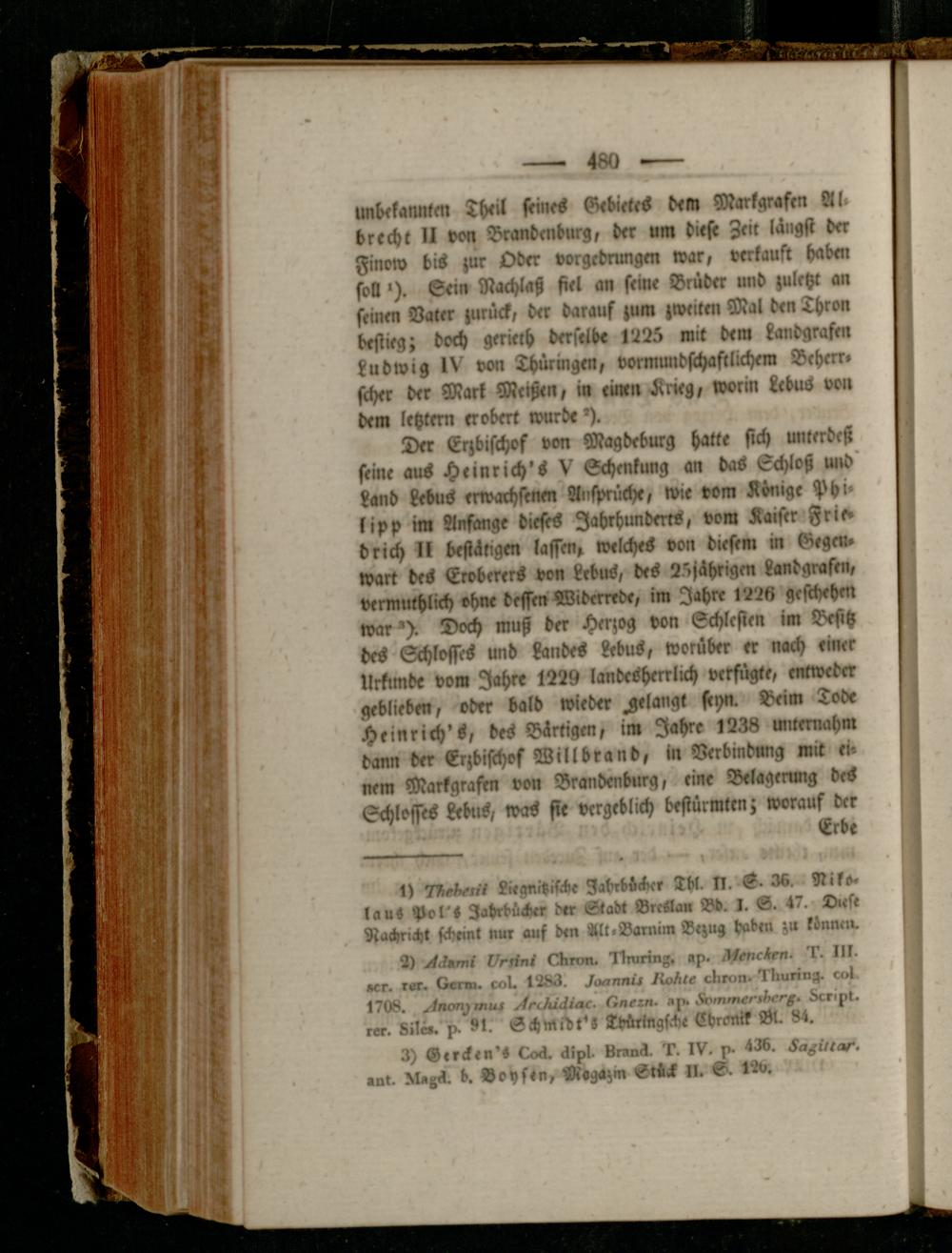Der Erzbischof von Magdeburg hatte sich unterdcß seine aus Heinrich's V Schenkung an das Schloß und' Land kebus erwachsenen Ansprüche, wie vom Könige Phi» kipp im Anfänge dieses Jahrhunderts, vom Kaiser Frie» brich kl bestätigen lassen, welches von diesem in Gegen. Wart des Eroberer- von kebus, des 25jährigen Landgrafen, vermuthlich ohne dessen Widerrede, im Jahre 1226 geschehen war'). Doch muß der Herzog von Schlesien im Besitz des Schlosses und Landes kebus, worüber er nach einer Urkunde vom Jahre 1229 landesherrlich verfügte, entweder geblieben, oder bald wieder gelangt ftyn. Beim Tode Heinrich's, d^ Bärtigen, im Jahre 1238 unternahm dann der Erzbischof Will dran d, in Verbindung mit einem Markgrafen von Brandenburg, eine Belagerung deS Schlosses Lebus, was sie vergeblich bestürmten; worauf der