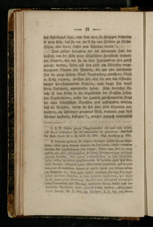 Dem zufolge betrachten wir die bedeutende Zahl der Westlich von der Elbe unter Sächsischer Herrschaft wohnenden Wenden, wie wir sie im Ren Jahrhunderte hier zuerst gewahr werden, lieber als den einst am Weitesten vprge- drungenen Stamm der Wenden, die um eine unbekannte Zeit die ganze spätere Mark Brandenburg erwähnter Weise in Besitz nahmen, welchen sich aber die von den Elbmün- dungen herabkommenden Sachsen, nach kurzer Zeit seines freien Bestehens, unterworfen haben. Kein deutlicher Bericht ist von diesen in die Urgeschichte der Sachsen fallenden Begebenheiten, außer der ziemlich gleichlautenden Sage bei allen Sächsischen Kronisten uns aufbehalten worden, daß die Sachsen, indem sie sich über diese Gegenden verbreiteten, ein Thüringer genanntes Volk,, worunter man diese Wenden verstand, besiegten welches dadurch vermuthlich