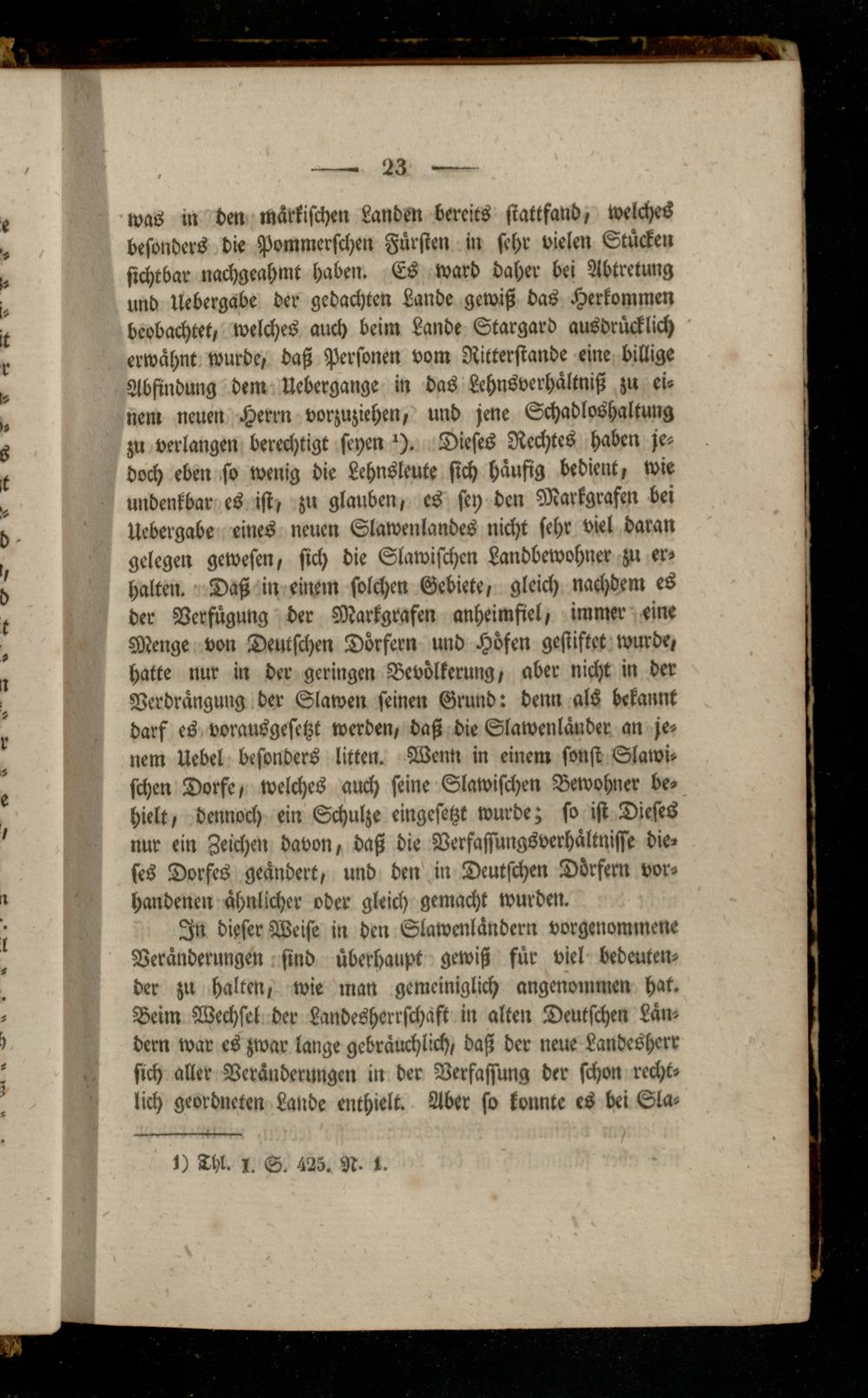 was rn Len märkischen Landen bereits stattfand, welches besonders die Pommerschen Fürsten in sehr vielen Stücken sichtbar nachgeahmt haben. Es ward daher bei Abtretung und Uebergabe der gedachten Lande gewiß das Herkommen beobachtet, welches auch beim Lande Stargard ausdrücklich erwähnt wurde, daß Personen vom Ritterstande eine billige Abfindung dem Uebergange in das Lehnsverhältniß zu einem neuen Herrn vorzuziehen, und jene Schadloshaltung zu verlangen berechtigt seyen *). Dieses Rechtes haben jedoch eben so wenig die Lehnsleute sich häufig bedient, wie undenkbar es ist, zu glauben, cs sey den Markgrafen bei Uebergabe eines neuen Slawenlandes nicht sehr viel daran gelegen gewesen, sich die Slawischen Landbewohner zu erhalten. Daß in einem solchen Gebiete, gleich nachdem es der Verfügung der Markgrafen anheimfiel, immer eine Menge von Deutschen Dörfern und Höfen gestiftet wurde, hatte nur in der geringen Bevölkerung, aber nicht in der Verdrängung der Slawen seinen Grund: denn als bekannt darf es vorausgesetzt werden, daß die Slawenländer an jenem Uebel besonders litten. Wenn in einem sonst Slawischen Dorfe, welches auch seine Slawischen Bewohner be, hielt, dennoch ein Schulze eingesetzt wurde; so ist Dieses nur ein Zeichen davon, daß die Verfassungsverhältnisse dieses Dorfes geändert, und den in Deutschen Dörfern vorhandenen ähnlicher oder gleich gemacht wurden.