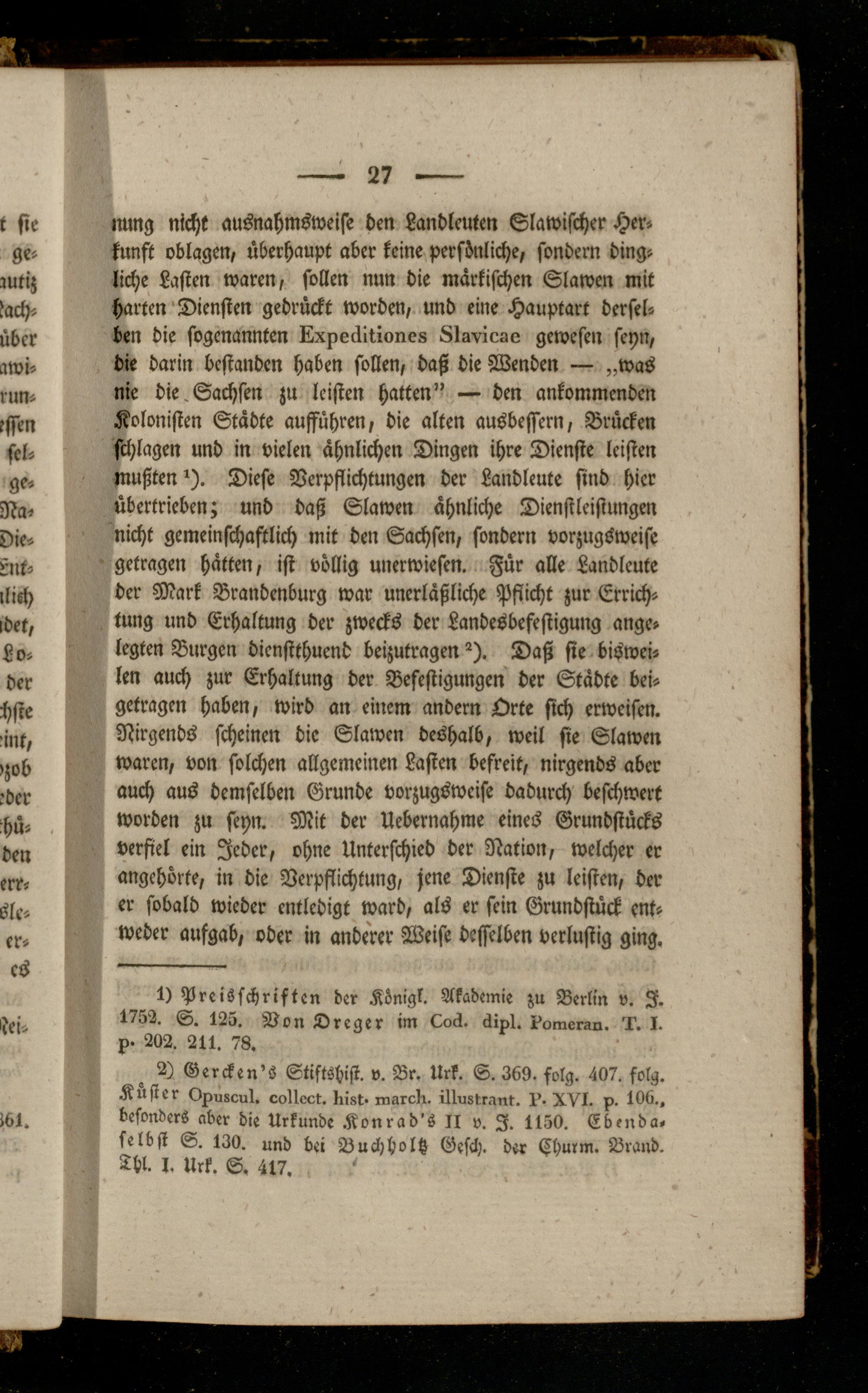nung nicht ausnahmsweise den Landlcuten Slawischer Herkunft oblagen, überhaupt aber keine persönliche, sondern dingliche Lasten waren, sollen nun die märkischen Slawen mit harten Diensten gedrückt worden, und eine Hauptart derselben die sogenannten Lxpeäitiones 8Iavicr>e gewesen seyn, die darin bestanden haben sollen, daß die Wenden — „was nie die , Sachsen zu leisten hatten" — den ankommenden Kolonisten Städte aufführen, die alten ausbessern, Brücken schlagen und in vielen ähnlichen Dingen ihre Dienste leisten mußten*). Diese Verpflichtungen der Landleute sind hier übertrieben; und daß Slawen ähnliche Dienstleistungen nicht gemeinschaftlich mit den Sachsen, sondern vorzugsweise getragen hätten, ist völlig unerwiesen. Für alle Landlcute der Mark Brandenburg war unerläßliche Pflicht zur Errichtung und Erhaltung der zwecks der Landesbefestigung angelegten Burgen dienstthuend beizutragen *). Daß sie bisweilen auch zur Erhaltung der Befestigungen der Städte beigetragen haben, wird an einem andern Orte sich erweisen. Nirgends scheinen die Slawen deshalb, weil sie Slawen waren, von solchen allgemeinen Lasten befreit, nirgends aber auch aus demselben Grunde vorzugsweise dadurch beschwert worden zu seyn. Mit der Uebernahme eines Grundstücks verfiel ein Jeder, ohne Unterschied der Nation, welcher er angchörte, in die Verpflichtung, jene Dienste zu leisten, der er sobald wieder entledigt ward, als er sein Grundstück entweder aufgab, oder in anderer Weise desselben verlustig ging.