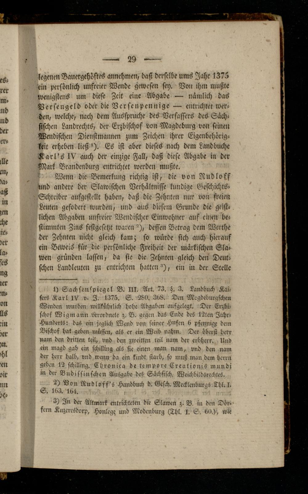 1) Sachsenspiegel B. III. Art. 73. §. 3. Landblich Kaisers Karl IV v- I. 1375. S. 280. 368. Den Magdeburgschen Wenden wurden willkährlich hohe Abgaben aufgelegt. Der Erzbischof Wigmann verordnele z. B. gegen das Ende deS 12ten Zahr- Hunderts: das ein jeglich Wend von seiner Hufen 6 Pfennige dein Bischof hat geben muffen, als er ein Weib nahm. Der öberst Herr nam den dritteir teil,. vnd den zweitten teil nam der erbherr. Und «in magd gab ein schilling als sie einen man nam, vnd den nam der Herr halb, vnd wenn da ein kindt starb, so muß man dem Herrn geben 12 schilling. Chronica de tempore Creationis mundi in der Budissinschen Ausgabe des Sächsisch. WeichbildSrechteS.