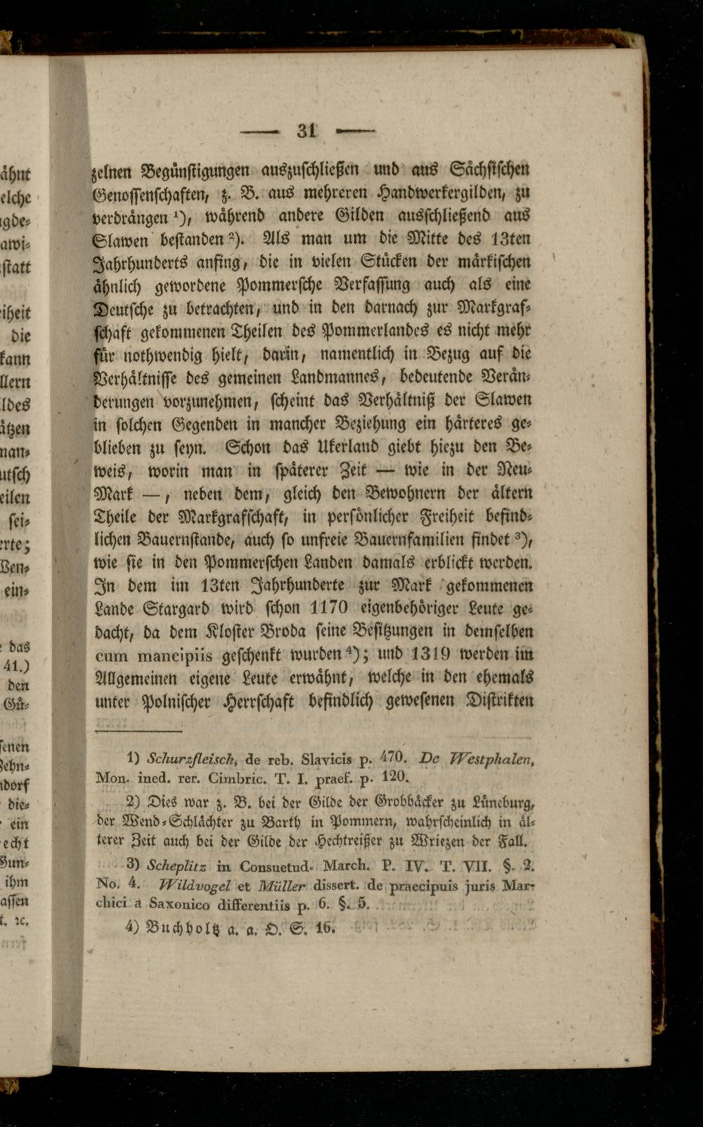 zelnen Begünstigungen auszuschließcn und aus Sächsischen Genossenschaften, B. aus mehreren Handwerkergilden, zu verdrängen *), während andere Gilden ausschließend aus Slawen bestanden 2 ). Als man um die Mitte des 13ten Jahrhunderts anfing, die in vielen Stücken der märkischen ähnlich gewordene Pommersche Verfassung auch als eine Deutsche zu betrachten, und in den darnach zur Markgrafschaft gekommenen Theilen des Pommcrlandcs es nicht mehr für nothwendig hielt, dann, namentlich in Bezug auf die Verhältnisse des gemeinen Landmannes, bedeutende Veränderungen vorzunehmen, scheint das Vcrhältniß der Slawen in solchen Gegenden in mancher Beziehung ein härteres geblieben zu seyn. Schon das Ukerland giebt hiezu den Beweis, worin man in späterer Zeit — wie in der Neu- Mark —, neben dem, gleich den Bewohnern der ältem Lheile der Markgrafschaft, in persönlicher Freiheit befindlichen Bauernstände, auch so unfreie Bauernfamilien findet ^), wie sie in den Pommerschen Landen damals erblickt werden. In dem im 13ten Jahrhunderte zur Mark gekommenen Lande Stargard wird schon 1170 eigenbehöriger Leute gedacht, da dem Kloster Broda seine Besitzungen in demselben cum mancipii« geschenkt wurden 4); und 1310 werden im Allgemeinen eigene Leute erwähnt, welche in den ehemals unter Polnischer Herrschaft befindlich gewesenen Distrikten