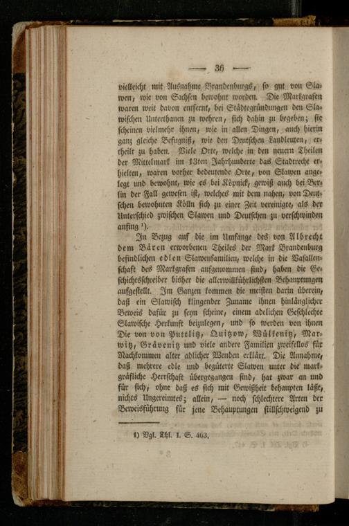 In Bezug auf die im Umfange des von Albrrcht dem Baren erworbenen Theiles der Mark Brandenburg befindlichen edlen Slawenfamilien, welche in die Vasallenschaft des Markgrafen ausgenommen sind, haben die Geschichtsschreiber bisher die allcrwillkührlichsten Behauptungen aufgestellt. Im Ganzen kommen die meisten darin überein, baß ein Slawisch klingender Zuname ihnen hinlänglicher Beweis dafür zu seyn scheine, einem adelichen Geschlechts Slawische Herkunft beizulegen, und so werden von ihnen Die von von Puttlitz, Quitzow, Wülkenitz, Marwitz, Grävenitz und viele andere Familien zweifellos für Nachkommen alter üblicher Wenden erklärt. Die Annahme, daß mehrere edle und begüterte Slawen unter die markgräfliche Herrschaft übergegangen sind, hat zwar an und für sich, ohne daß es sich mit Gewißheit behaupten läßt, nichts Ungereimtes; allein, — noch schlechtere Arten der Beweisführung für jene Behauptungen stillschweigend zu