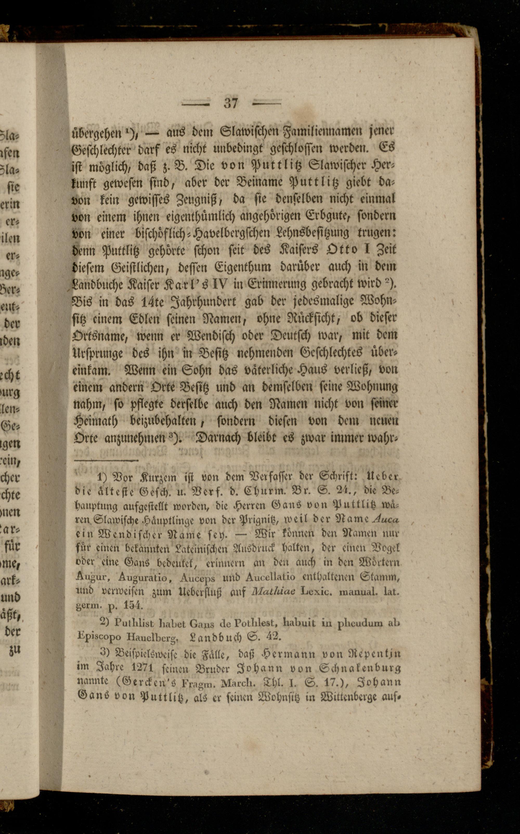 1) Vor Kurzem ist von dem Verfasser der Schrift: Ueber die älteste Gesch. u. Vers. d. Churm. Br. S. 21., die Behauptung ausgestellt worden, die Herren Gans von Puttlitz wären Slawisch« Häuptlinge von dcr Prignitz, weil der Name