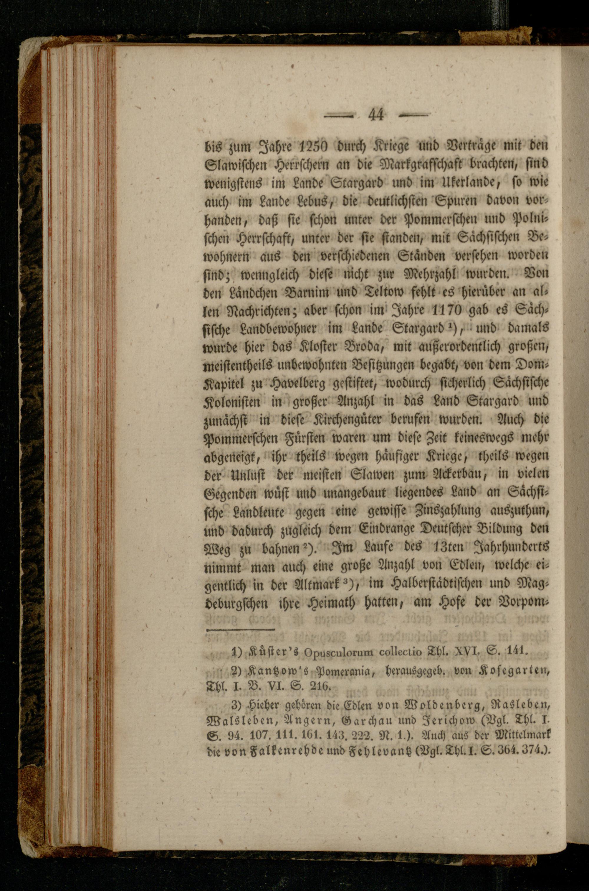 bis zum Jahre 1250 durch Kriege und Verträge mit den Slawischen Herrschern an die Markgrasscl)aft brachten, sind wenigstens im Lande Stargard und im Ukerlande, so wie auch im Lande Lebus, die deutlichsten Spuren davon vorhanden, daß sie schon unter der Pommcrschen und Polnischen Herrschaft, unter der sie standen, mit Sächsischen Bewohnern aus den verschiedenen Ständen versehen worden sind; wenngleich diese nicht zur Mehrzahl wurden. Von den Ländchen Barnim und Teltow fehlt es hierüber an al. len Nachrichten; aber schon im Jahre 1170 gab es Sächsische Landbewohner im Lande Stargard *),-und damals wurde hier das Kloster Broda, mit außerordentlich großen, rneistentheils unbewohnten Besitzungen begabt, von dem Dom- Kapitel zu Havelberg gestiftet, wodurch sicherlich Sächsische Kolonisten in großer Anzahl in das Land Stargard und zunächst in diese Kirchengüter berufen wurden. Auch die Pommerschen Fürsten waren um diese Zeit keineswegs mehr abgeneigt, ihr theils wegen häufiger Kriege, theils wegen der Unlust der meisten Slawen zum Ackerbau, in vielen Gegenden wüst und unangebaut liegendes Land an Sächsische Landleute gegen eine gewisse Zinszahlung auszuthun, und dadurch zugleich dem Eindrange Deutscher Bildung den Weg zu bahnen °). Im Laufe des IZten Jahrhunderts nimmt man auch eine große Anzahl von Edlen, welche eigentlich in der Altmark ^), im Halberstädtischen und Mag- deburgschen ihre Heimath hatten, am Hofe der Vorpom-