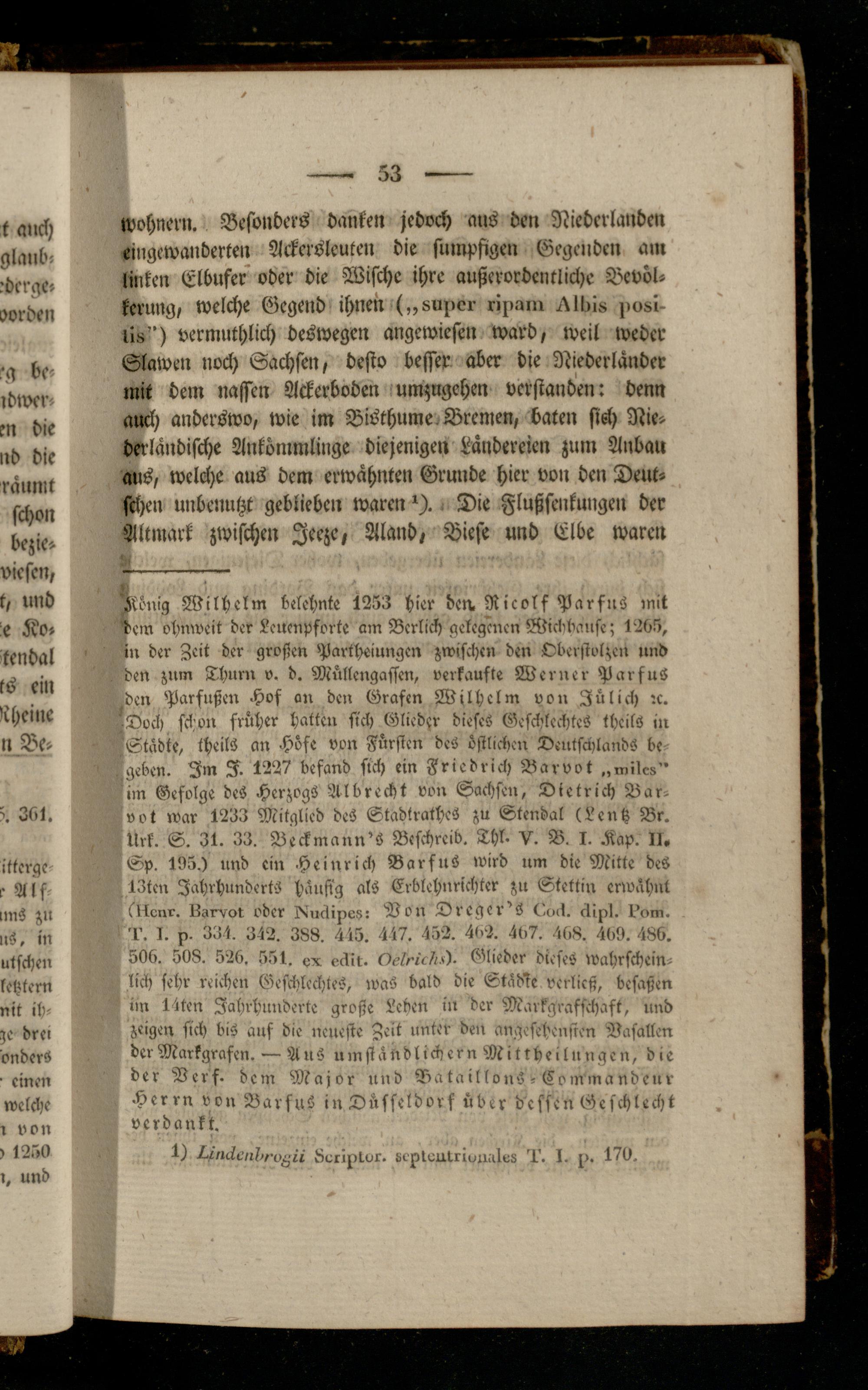 Röilig Wilhelm belehnte 1253 hier den. Ricolf ParsuS mit Dem ohmveit der Leucnpforte am Bcrlich gekegenen Wiel,banse; 1205, in der Zeit der grossen Partheiungen zwischen den Oberstvlzen und den znm Thurn v. d. Müklengassen, »erkaufte Werner ParfuS Mvden Parfußen Hof an den Grafen Wilhelm von Jülich :e. uMjDoch silu'n früher hatten sich Glieder dieses Geschlechtes thcils in ÄNStadte, theilS an Höfe von Fürsten des östlichen Deutschlands bc --Mgeben. Im I. 1227 befand sich ein Friedrich Barvot „milcs" iin Gefolge des Herzogs Älbrecht von Sachsen, Dietrich Barvot war 1233 Mitglied deS Stadtrathes zu Stendal (Lentz Br. Urk. S. 31. 33. Veckmann'S Beschreib. Thl. V. B. I. Kap. II. Sp. 195.) und ein Heinrich BarfuS wird um die Mitte des 13tcn Jahrhunderts häufig als Erblehnrichter zu Stettin erwähnt sllonr. Larvot oder lbiucii^es: Bon Dreger's täo3. ciipl. I'om.