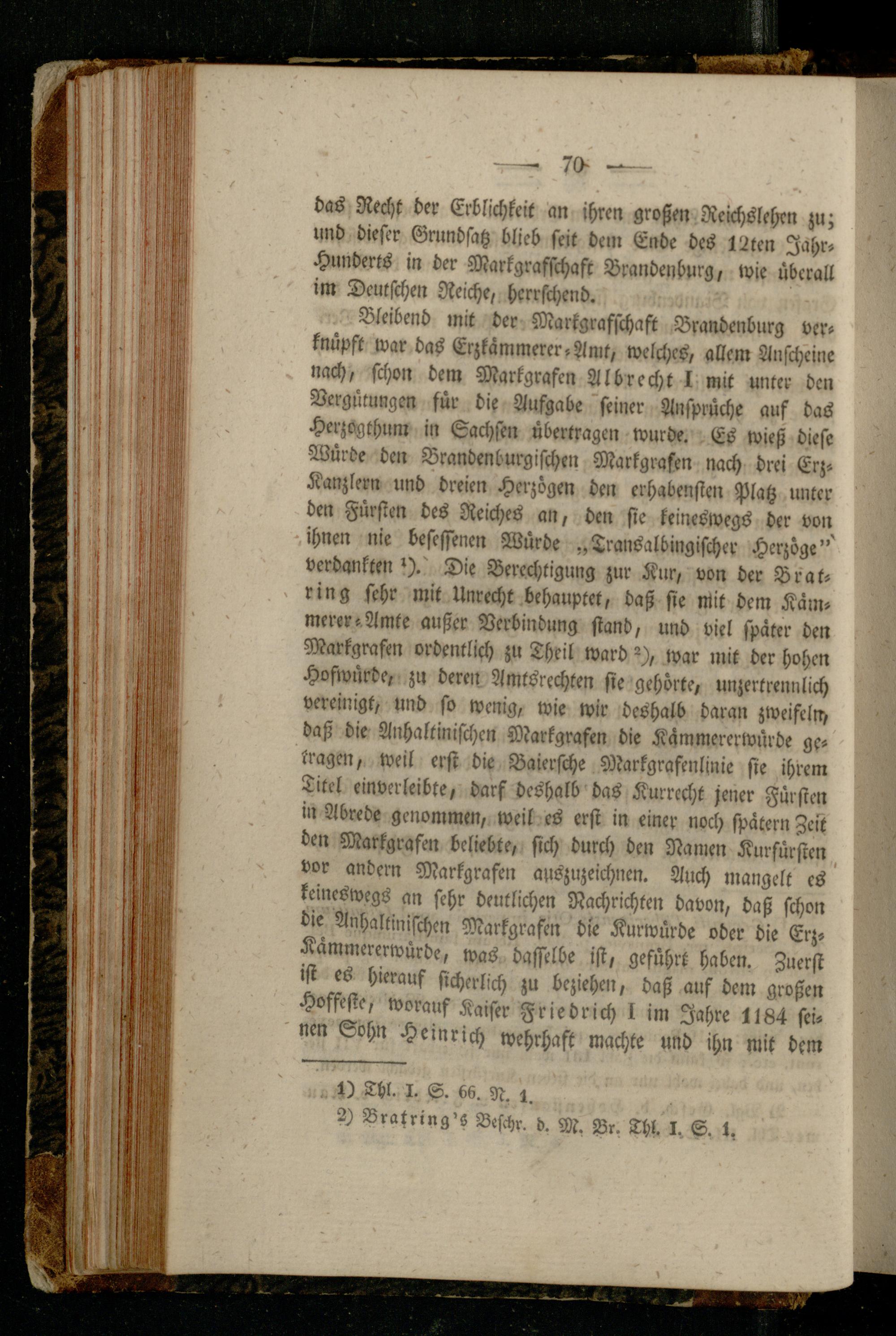 Bleibend mit der Markgrafschaft Brandenburg verknüpft war bas Erzkämmerer-Amt/ welches/ allem Anscheine nach/ schon dem Markgrafen Albrecht I mit unter den Vergütungen für die Aufgabe seiner Ansprüche auf das Herjogthum in Sachsen übertragen wurde. Es wieß diese Würde den Brandenburgischen Markgrafen nach drei Erz- Kanzlern und dreien Herzogen den erhabensten Platz unter den Fürsten des Reiches an/ den sie keineswegs der von ihnen nie besessenen Würde „Transalbingischer Herzoge"" verdankten*). Die Berechtigung zur Kur/ von der Bratring sehr mit Unrecht behauptet/ daß sie mit dem Kämmerer-Amte außer Verbindung stand/ und viel später den Markgrafen ordentlich zu Theil ward ^)/ war mit der hohen Hofwürde/ zu deren Amtsrechten sie gehörte/ unzertrennlich vereinigt/ und so wenig/ wie wir deshalb daran zweifeln/ daß die Anhaltinischcn Markgrafen die Kämmererwürde getragen/ weil erst die Baiersche Markgrafenlinie sie ihrem Titel einverleibte/ darf deshalb das Kurrccht jener Fürsten in Abrede genommen/ weil cs erst in einer noch spätem Zeit den Markgrafen beliebte/ sich durch den Namen Kurfürsten vor andern Markgrafen auszuzeichnen. Auch mangelt cs keineswegs an sehr deutlichen Nachrichten davon/ daß schon die Anhaltinischen Markgrafen die Kurwürde oder die Erz- Kämmererwürde/ was dasselbe ist/ geführt haben. Zuerst ist es hierauf sicherlich zu beziehe»/ daß auf dem großen Hoffeste/ worauf Kaiser Friedrich 1 im Jahre 1184 seinen Sohn Heinrich wehrhaft machte und ihn mit dem