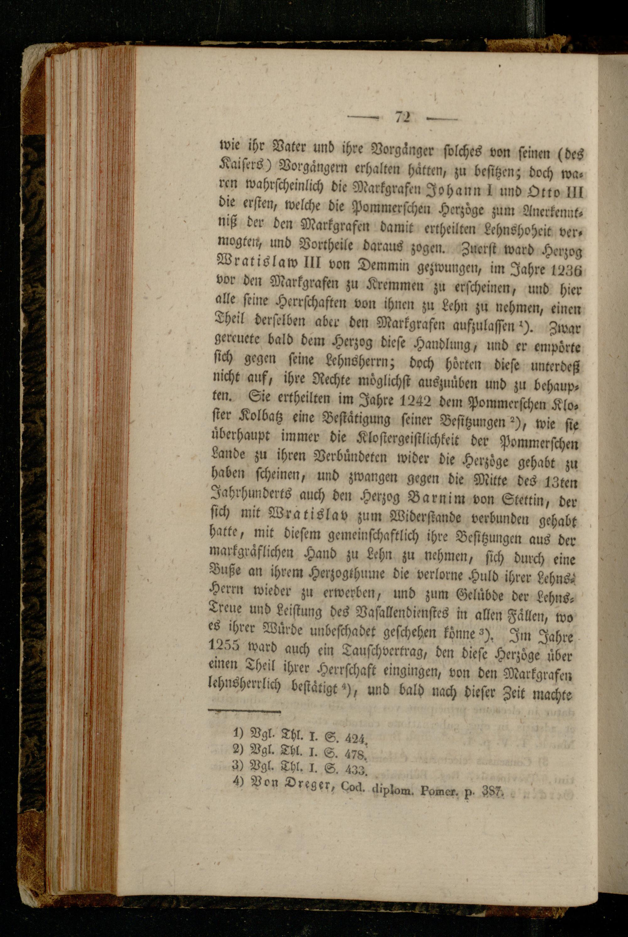 wie ihr Vater und ihre Vorgänger solches von seinen (des Kaisers) Vorgängern erhalten hatten, zu besitzen; doch wa. rcn wahrscheinlich die Markgrafen Johann I und Otto IN die ersten, welche die Pommerschen Herzoge zum Anerkennt» niß der den Markgrafen damit ertheilten Lehnshohcit ver» nwgten, und Vorthelle daralls zogen. Zuerst ward Herzog Wratislaw UI von Demmin gezwungen, im Jahre 1238 vor dm Markgrafen zu Kremmen zu erscheinen, und hier alle seine Herrschaften von ihnen zu Lehn zu nehmen, einen Theil derselben aber den Markgrafen aufzulassen'). Zwar gereuete bald dem Herzog diese Handlung, und er empörte sich gegen seine Lehnsherrn; doch hörten diese unterdeß nicht auf, ihre Rechte möglichst auszuüben und zu behaup» ten. Sie ertheilten im Jahre 1242 dem Pommerschen Kloster Kolbatz eine Bestätigung seiner Besitzungen ^), wie sie überhaupt immer die Klosiergeisilichkeit der Pommerschen Lande zu ihren Verbündeten wider die Herzöge gehabt zu haben scheinen, und zwangen gegen die Mitte des IZten Jahrhunderts auch den Herzog Barnim von Stettin, der sich mit Wratislav zum Widerstande verbunden gehabt hatte, mit diesem gemeinschaftlich ihre Besitzungen aus der markgräflichen Hand zu Lehn zu nehmen, sich durch eine Buße an ihrem Herzogthume die verlorne Huld ihrer Lehns- Herrn wieder zu erwerben, und zum Gelübde der Lehns- Treue und Leistung des Vafallendienstes in allen Fällen, wo es ihrer Würde unbeschadet geschehen könne ^), Im Jahre 1255 ward auch ein Tauschvcrtrag, den diese Herzöge über einen Theil ihrer Herrschaft eingingen, von den Markgrafen lehnsherrlich bestätigt*), und bald nach dieser Zeit machte