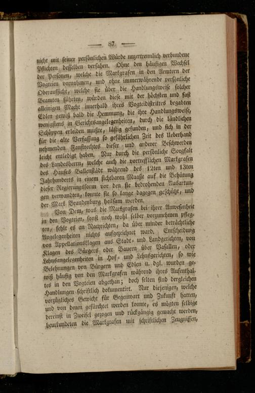 nicht mit seincr persönlichen Würde unzertrennlich verbundene Pflichten desselben versahen. Ohne den häufigen Wechsel der Personen, welche die Markgrafen in den Ae intern der Vogtcien Vornahmen, und ohne immerwährende persönliche Oberaufsicht, welche sie über die Handlungsweise solcher Beamten führtet!, würden diese mit der höchsten und fast alleinigen Macht innerhalb ihres Vogtcidistriktes begabten Edlen gewiß bald die Hemmung, die ihre Handlungsweise, wenigstens in Gerichtsangelegenheitcn, durch die ländlichen Schöppen erleiden mußte, lästig gefunden, und sich in der für die alte Verfassung so gefährlichen Zeit des Ueberhanb nehmenden Faustrechtes dieser und anderer Beschwerden leicht entledigt haben. Nur durch die persönliche Sorgfalt des Landesherrn, welche auch die vortrefflichen Markgrafen des Hauses Ballenstadt während des 12ten und 13ten Jahrhunderts in einem sichtbaren Maaße auf die Behütung .dieser Regierungsform vor den sie bedrohenden Ausartungen verwandten, konnte sie so lange dagegen geschützt, und der Mark Brandenburg heilsam werden.