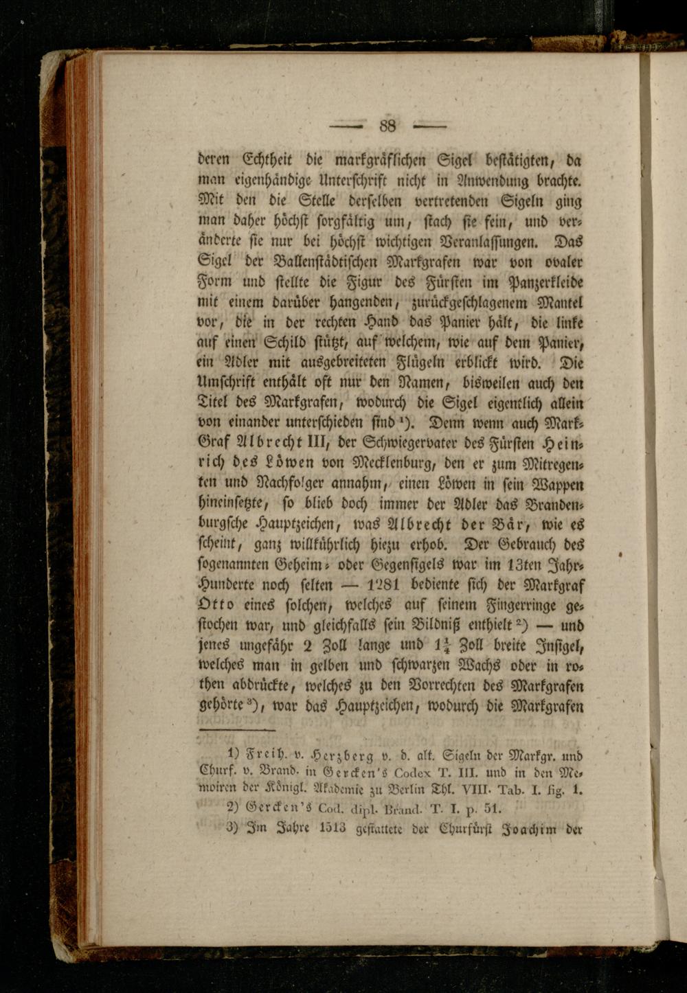 deren Echtheit die markgräflichen Sigel bestätigten, da man eigenhändige Unterschrift nicht in Anwendung brachte. Mit den die Stelle derselben vertretenden Sigeln ging man daher höchst sorgfältig um, stach sie fein, und veränderte sie nur bei höchst wichtigen Veranlassungen. Das Sigel der Ballenstädtifchen Markgrafen war von ovaler Form und stellte die Figur des Fürsten im Panzerklcide mit einem darüber Hangenden, zurückgeschlagenem Mantel vor, die in der rechten Hand das Panier hält, die linke auf einen Schild stützt, auf welchem, wie auf dem Panier, ein Adler mit ausgebreiteten Flügeln erblickt wird. Die Umschrift enthält oft nur den Namen, bisweilen auch den Titel des Markgrafen, wodurch die Sigel eigentlich allein von einander unterschieden sindDenn wenn auch Mark- Graf Albrecht Hl, der Schwiegervater des Fürsten Heinrich des Löwen von Mecklenburg, den er zum Mitregenten und Nachfolger annahm, einen Löwen in sein Wappen hineinfetzte, so blieb doch immer der Adler das Branden- burgfche Hauptzeichen, was Albrecht der Bär, wie es scheint, ganz willkührlich hiezu erhob. Der Gebrauch des sogenannten Geheim- oder Gegensigels war im IZten Jahr- Hunderte noch selten -— 1281 bediente sich der Markgraf Otto eines solchen, welches auf seinem Fingerringe gestochen war, und gleichfalls fein Bildniß enthielt — und jenes ungefähr 2 Zoll lange und 1^ Zoll breite Jnsigel, welches man in gelben und schwarzen Wachs oder in rochen abdrückte, welches zu den Vorrechten des Markgrafen gehörte °), war das Hauptzeichen, wodurch die Markgrafen