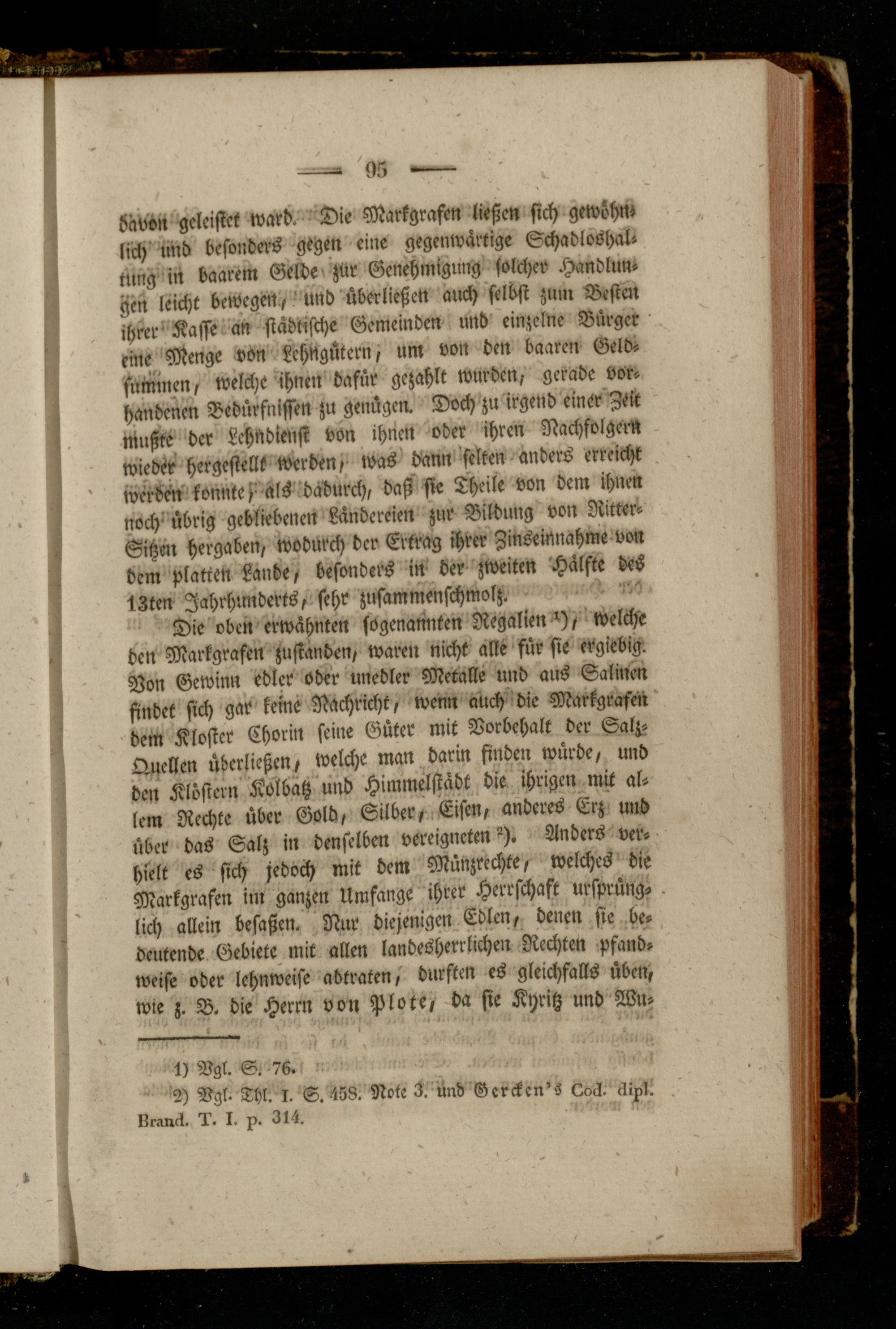 Die oben erwähnten sogenannten Regalien '), welche den Markgrafen zustanden, waren nicht alle für sie ergiebig. Von Gewinn edler oder unedler Metalle und aus Salinen findet sich gar kerne Nachricht, wenn auch die Markgrafen dem Kloster Chorin seine Güter mit Vorbehalt der Salz- Quellen überließen, welche man darin finden würde, und den Klöstern Mbatz und Himmelstädt die ihrigen mit allem Rechte über Gold, Silber, Eisen, anderes Erz und über das Salz in denselben »ereigneten'). Anders verhielt es sich jedoch mit dem Münzrechte, welches die Markgrafen im ganzen Umfange ihrer Herrschaft ursprünglich allein befaßen. Nur diejenigen Edlen, denen sie bedeutende Gebiete mit allen landesherrlichen Rechten pfandweise oder lehnweise abtraten, durften es gleichfalls üben, wie z. B. die Herrn von Plote, da sie Kyritz und Wil