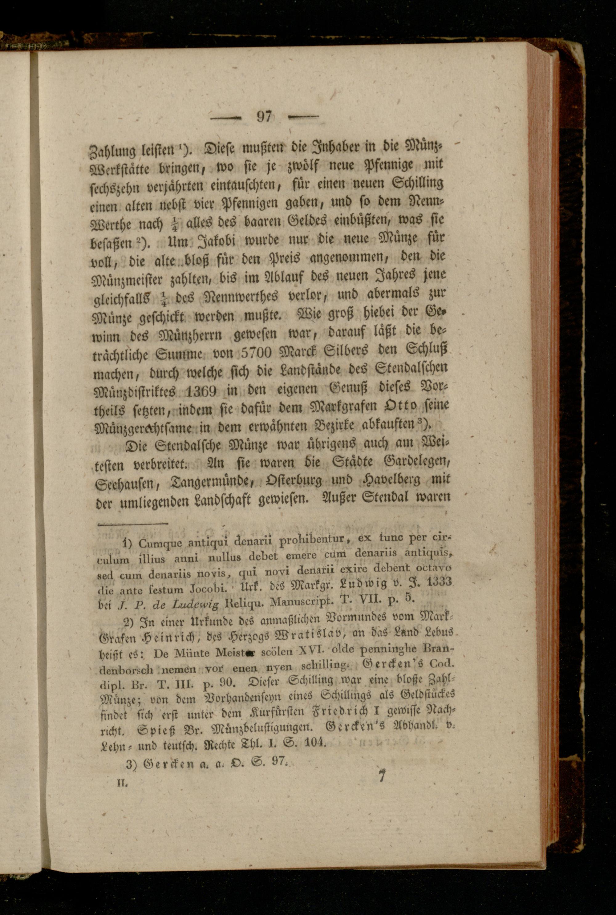 Zahlung leisten'). Diese mußten die Inhaber in die Münz, Werkstätte bringen, wo sie je zwölf neue Pfennige mit sechszehn verjährten eintauschten, für einen neuen Schilling einen alten nebst vier Pfennigen gaben, und so dem Nenn» Werehe nach ^ alles des baaren Geldes einbüßten, was sie besaßen °). Um Jakobi wurde nur die neue Münze für voll, die alte „bloß für den Preis angenommen, den die Münzmeister zahlten, bis im Ablauf des neuen Jahres jene gleichfalls * des Nennwerthes verlor, und abermals zur Münze geschickt werden mußte. Wie groß hiebei der Ge» winn des Münzherrn gewesen war, darauf läßt die beträchtliche Summe von 5700 Marck Silbers den Schluß machen, durch welche sich die Landstände des Stendalschen Münzdisiriktes 1369 in den eigenen Genuß dieses Vor- theils setzten, indem sie dafür dem Markgrafen Otto seine Münzgerechtsame in dem erwähnten Bezirke abkauften ^).