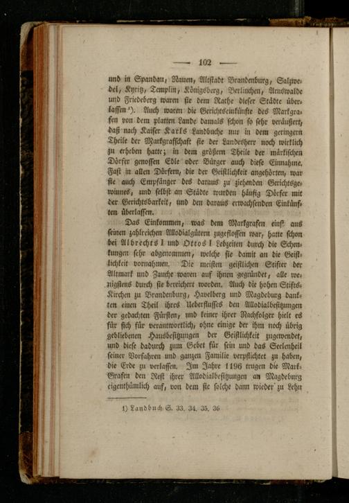 Das Einkommen, was dem Markgrafen einst aus seinen zahlreichen Allodialgütern zugeflossen war, hatte schon bei Albrechts I und Ottos I Lebzeiten durch die Schenkungen sehr abgenommen, welche sie damit an die Geist- , lichkeit Vornahmen. Die meisten geistlichen Stifter der Altmark und Zauche waren auf ihnen gegründet, alle wenigstens durch sie bereichert worden. Auch die hohen Stifts- Kirchen zu Brandenburg, Havelberg und Magdeburg dankten einen Lheil ihres Ueberflusses den Allodialbesitzungen der gedachten Fürsten, und keiner ihrer Nachfolger hielt es für sich für verantwortlich, ohne einige der ihm noch übrig gebliebenen Hausbesitzungen der Geistlichkeit zugewendet, und diese dadurch zum Gebet für sein und das Seelenheil seiner Vorfahren und ganzen Familie verpflichtet zu haben, die Erde zu verlassen. Im Jahre 1196 trugen die Mark- Grafen den Rest ihrer Allodialbesitzungen an Magdeburg eigenthümlich auf, von dem sie solche dann wieder'zu Lehn
