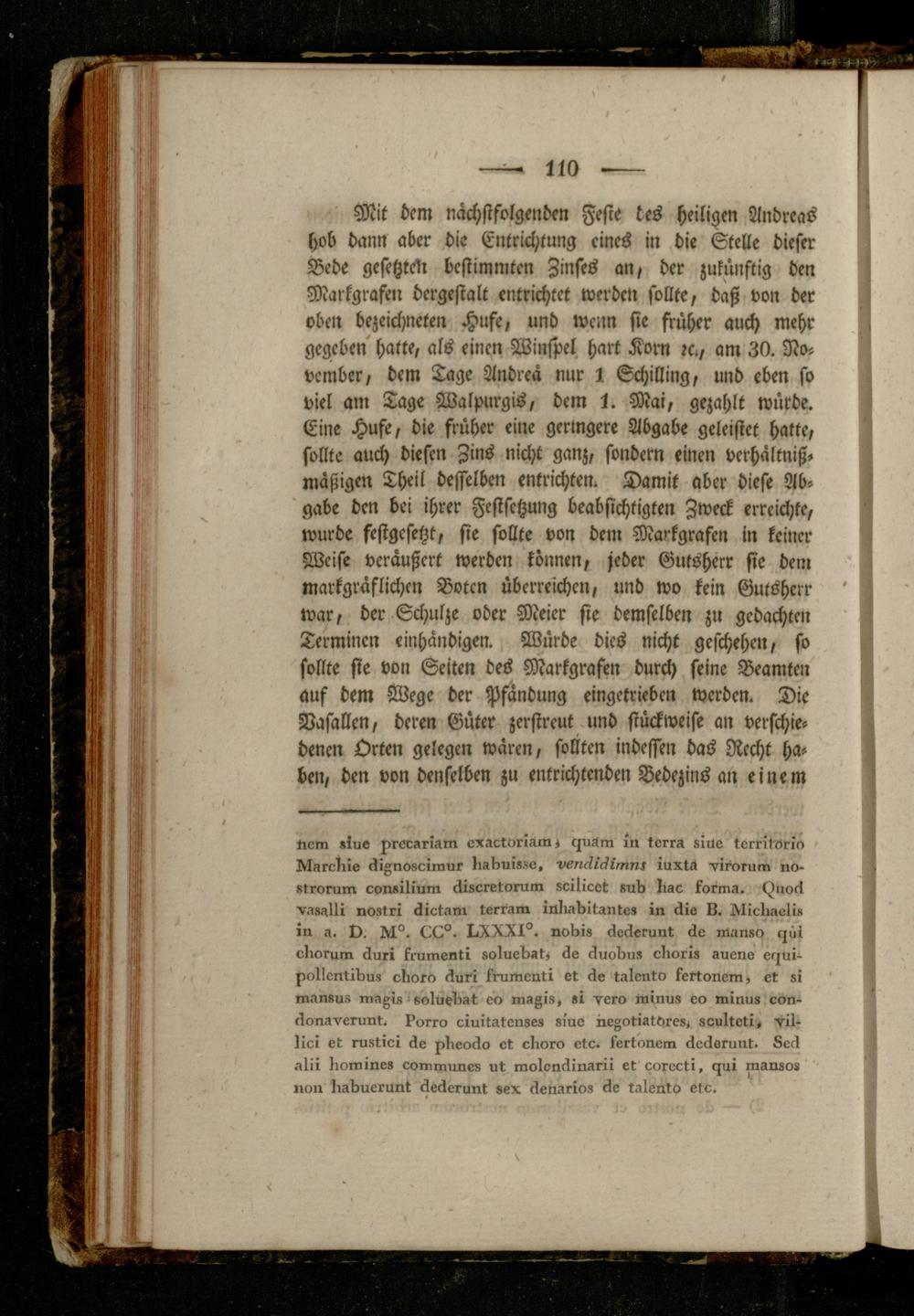 Mit dem nächstfolgenden Feste des heiligen Andreas hob dann aber die Entrichtung eines in die Stelle dieser Bede gesetzt, bestimmten Zinses an, der zukünftig den Markgrafen dergestalt entrichtet werden sollte, daß von der oben bezeichneten Hufe, und wenn sie früher auch mehr gegeben hatte, als einen Winspel hart Korn rc., am 30. November, dem Tage Andreä nur 1 Schilling, und eben so viel am Tage Walpurgis, dem 1. Mai, gezahlt würbe. Eine Hufe, die früher eine geringere Abgabe geleistet hatte, sollte auch diesen Zins nicht ganz, sondern einen verhältniß- mäßigen Theil desselben entrichten. Damit aber diese Abgabe den bei ihrer Festsetzung beabsichtigten Zweck erreichte, wurde festgesetzt, sie sollte von dem Markgrafen in keiner Weise veräußert werden können, jeder Gutsherr sie dem markgräflichen Boten überreichen, und wo kein Gutsherr war, der Schulze oder Meier sie demselben zu gedachten Terminen einhändigen. Würde dies nicht geschehen, so sollte sie von Seilen des Markgrafen durch seine Beamten auf dem Wege der Pfändung eingetrieben werden. Die Dafallen, deren Güter zerstreut und stückweise an verschiedenen Orten gelegen wären, sollten indessen das Recht haben, den von denselben zu entrichtenden Bedezins an einem