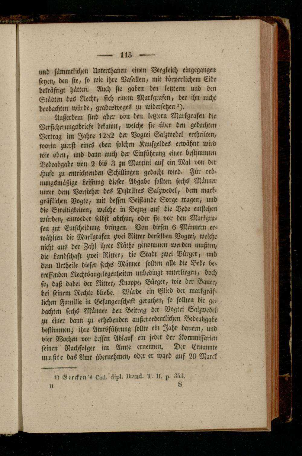 Außerdem sind aber von den letzter» Markgrafen die Versicherungsbriefe bekannt, welche sie über den gedachten Vertrag im Jahre 1282 der Vogtei Salzwedel ertheilten, worin zuerst eines eben solchen Kaufgeldes erwähnt wird wie oben, und dann auch der Einführung einer bestimmten Bedeabgabe von 2 bis 3 zu Martini auf ein Mal von der Hufe zu entrichtenden Schillingen gedacht wird. Für ordnungsmäßige Leistung dieser Abgabe sollten sechs Männer unter dem Vorsteher des Distriktes Salzwedel, dem markgräflichen Vogte, mit dessen Beistände Sorge tragen, und die Streitigkeiten, welche in Bezug auf die Bede entstehen würden, entweder selbst abthun, oder sie vor den Markgrafen zur Entscheidung bringen. Von diesen 6 Männern erwählten die Markgrafen zwei Ritter derselben Vogtei, welche nicht aus der Zahl ihrer Räche genommen werden mußten, die Landschaft zwei Ritter, die Stadt zwei Bürger, und dem Urtheile dieser sechs Männer sollten alle die Bede betreffenden Nechtsangelegenheiten unbedingt unterliegen, doch so, daß dabei der Ritter, Knappe, Bürger, wie der Bauer, bei seinem Rechte bliebe. Würde ein Glied der Markgraf lichen Familie in Gefangenschaft gerochen, so sollten die gedachten sechs Männer den Beitrag der Vogtei Salzwedel zu einer dann zu erhebenden außerordentlichen Bedeabgabe bestimmen; ihre Amtsführung sollte ein Jahr dauern, und vier Wochen vor dessen Ablauf ein jeder der Kommissarien seinen Nachfolger im Amte ernennen. Der Ernannte mußte das Amt übernehmen, oder er ward auf 20 Marek