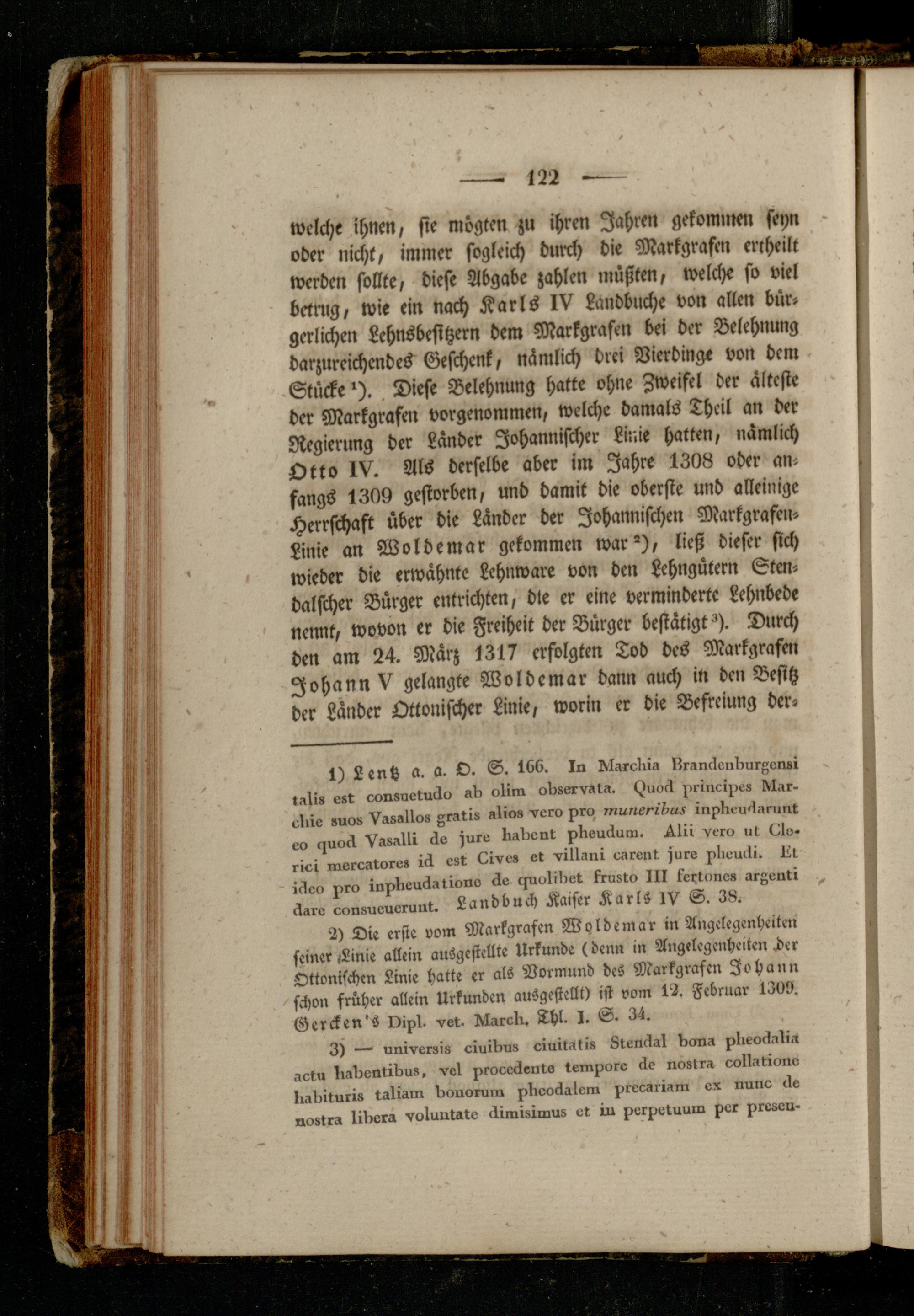 welche ihnen, sie megten zu ihren Jahren gekommen seyn oder nicht, immer sogleich durch die Markgrafen enhrilt werden sollte, diese Abgabe zahlen müßten, welche so viel betrug, wie ein nach Karls IV Landbuche von allen bürgerlichen Lehnsbesitzern dem Markgrafen bei der Belehnung darzureichendes Geschenk, nämlich drei Vierdingt von dem StückeDiese Belehnung hatte ohne Zweifel der älteste der Markgrafen vorgenommen, welche damals Lhcil an der Regierung der Länder Johannischer Linie hatten, nämlich Otto IV. Als derselbe aber im Jahre 1308 oder anfangs 1309 gestorben, und damit die oberste und alleinige Herrschaft über die Länder der Johannischen Markgrafeu- Linie an Woldemar gekommen war'), ließ dieser sich wieder die erwähnte Lehnware von den Lehngütern Stendalscher Bürger entrichten, die er eine verminderte Lehnbede nennt, wovon er die Freiheit der Bürger bestätigt Durch den am 24. März 1317 erfolgten Tod des Markgrafen Johann V gelangte Woldemar dann auch in den Besitz der Länder Ottonischer Linie, worin er die Befreiung der-
