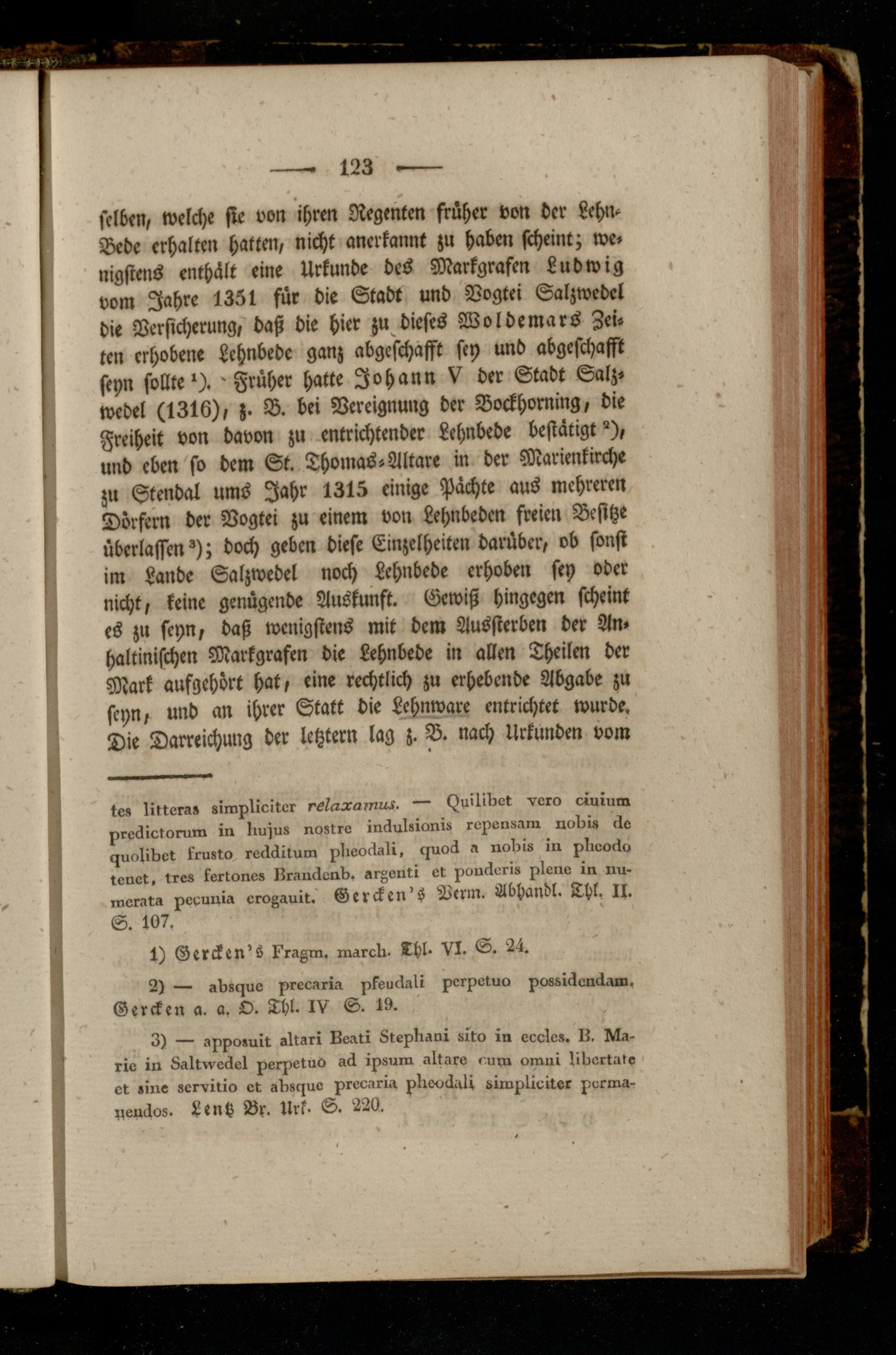 selben, welche sie von ihren Regenten früher von der Lehn- Bebe erhalten hatten, nicht anerkannt zu haben scheint; we- nigstens enthält eine Urkunde des Markgrafen Ludwig vom Jahre 1351 für die Stadt und Vogtei Salzwedel die Versicherung, daß die hier zu dieses Woldemars Zeiten erhobene Lehnbede ganz abgcschafft sey und abgeschasst seyn sollte*). - Früher hatte Johann V der Stadt Salzwedel (1316), z. B. bei Vereignung der Bockhoming, die Freiheit von davon zu entrichtender Lehnbede bestätigt"), und eben so dem St. Thomas-Altäre in der Marienkirche zu Stendal ums Jahr 1315 einige Pachte aus mehreren Dörfern der Vogtei zu einem von Lehnbeden freien Besitze überlassen °); doch geben diese Einzelheiten darüber, ob sonst im Lande Salzwedel noch Lehnbede erhoben sey oder nicht, keine genügende Auskunft. Gewiß hingegen scheint es zu seyn, daß wenigstens mit dem Aussterben der An- haltinischen Markgrafen die Lehnbede in allen Theilen der Mark aufgchört hat, eine rechtlich zu erhebende Abgabe zu seyn, und an ihrer Statt die Lehnware entrichtet wurde. Die Darreichung der letztem lag z. B. nach Urkunden vom