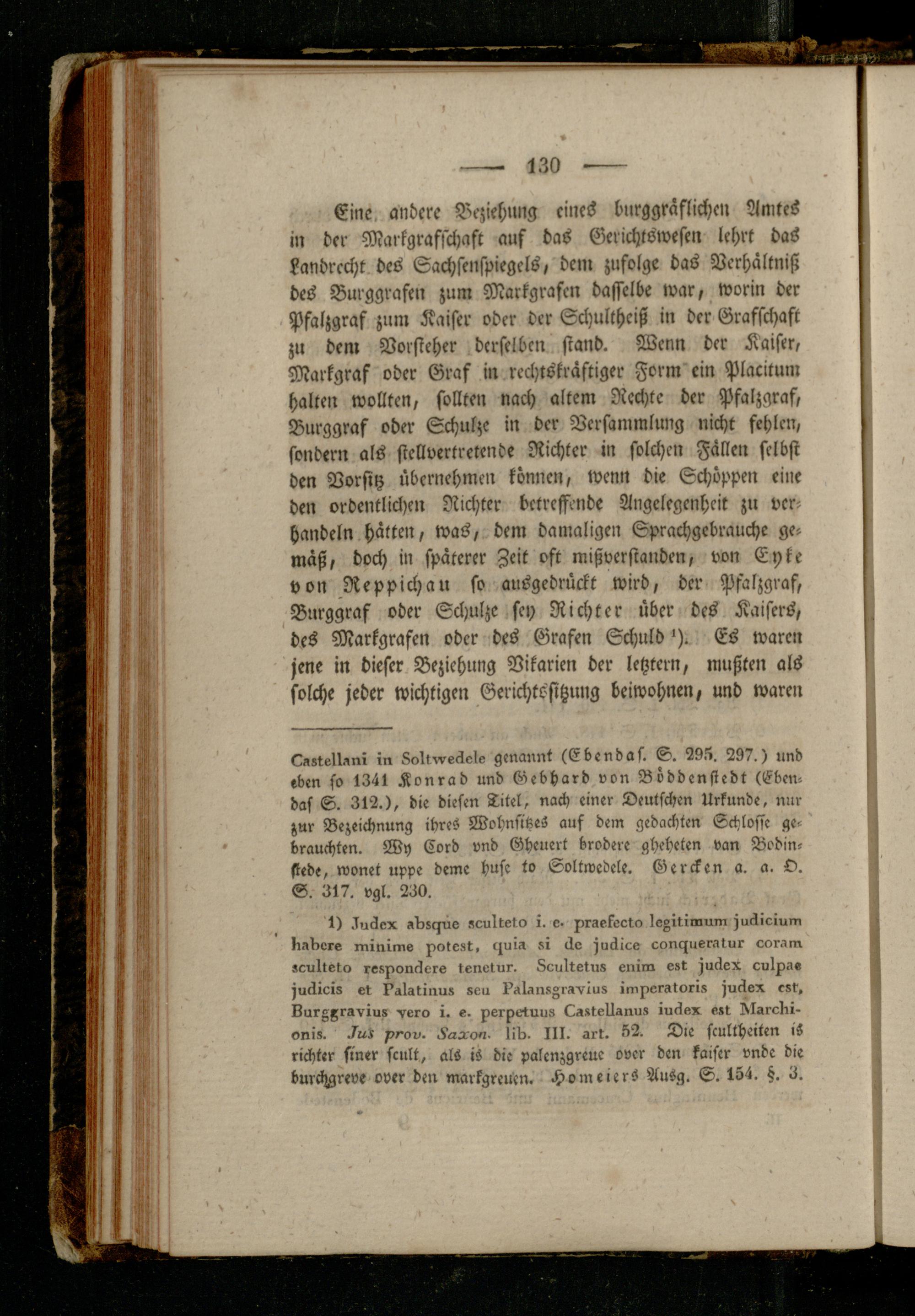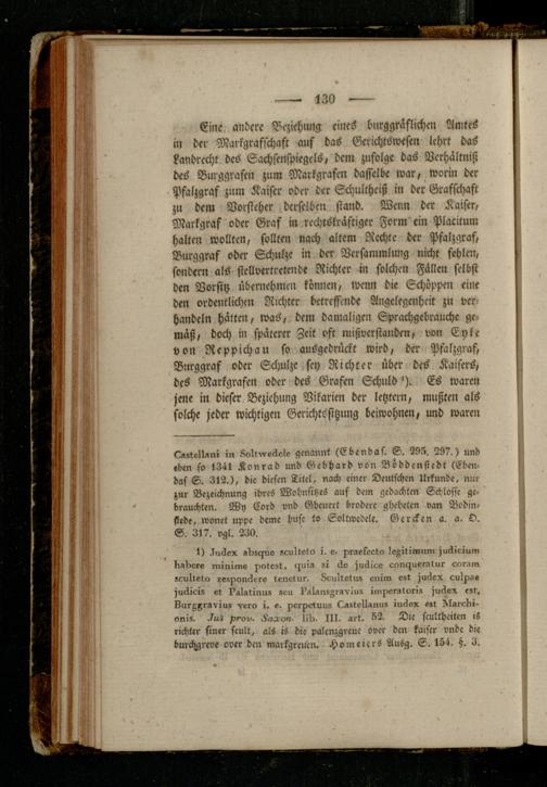 Eine andere Beziehung eines burggraflichen Amtes in der Markgrafschaft auf bas Gerichtswesen lehrt das Landrecht des Sachsenspiegels, dem zufolge das Verhältniß des Burggrafen zum Markgrafen dasselbe war, worin der Pfalzgraf zum Kaiser oder der Schultheiß in der Grafschaft zu dem Vorsteher derselben stand. Wenn der Kaiser, Markgraf oder Graf in rechtskräftiger Form ein Placitum halten wollten, sollten nach altem Rechte der Pfalzgraf, Burggraf oder Schulze in der Versammlung nicht fehlen, sondern als stellvertretende Richter in solchen Fällen selbst den Vorsitz übernehmen können, wenn die Schöppen eine den ordentlichen Richter betreffende Angelegenheit zu verhandeln hätten, was, dem damaligen Sprachgebrauche gemäß, doch in späterer Zeit oft mißverstanden, von Eyke von Reppichau so ausgedrückt wird, der Pfalzgraf, Burggraf oder Schulze sei) Richter über des Kaisers, des Markgrafen oder des Grafen Schuld'). Es waren jene in dieser Beziehung Marien der letztem, mußten als solche jeder wichtigen Gerichtssitzung beiwohnen, und waren