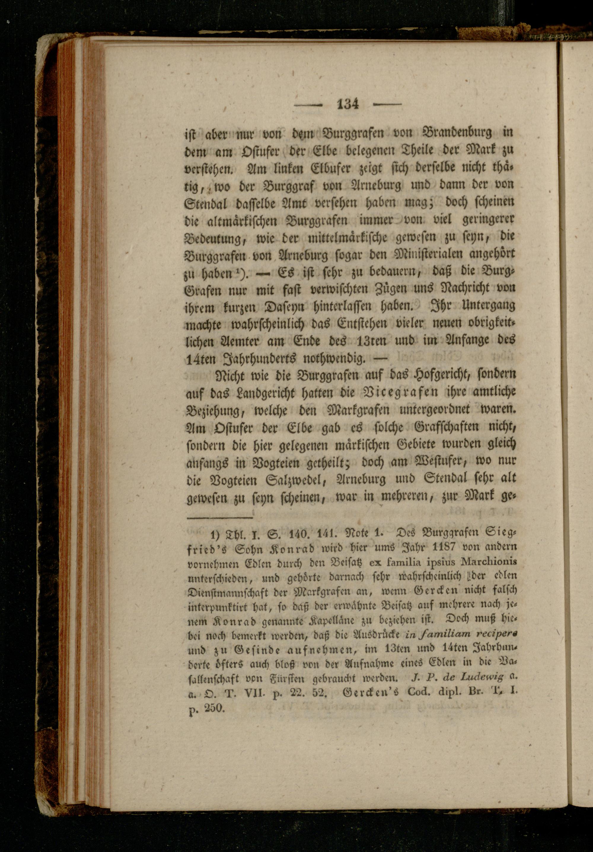 Nicht wie die Burggrafen auf das Hofgericht, sondern auf bas Landgericht hatten die Vicegrafen ihre amtliche Beziehung, welche den Markgrafen untergeordnet waren. Am Ostufer der Elbe gab cs solche Grafschaften nicht, sondern die hier gelegenen märkischen Gebiete wurden gleich anfangs in Vogteien gctheilt; doch am Westufer, wo nur die Vogteien Salzwedel, Arneburg und Stendal sehr alt gewesen zu seyn scheinen, war in mehreren, zur Mark ge»